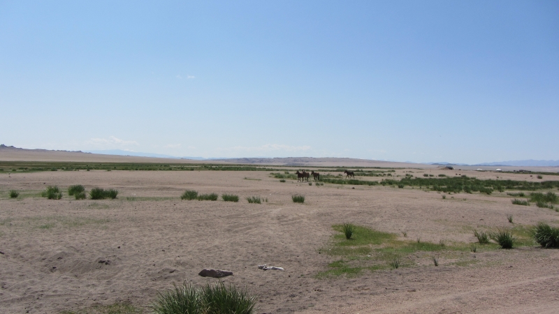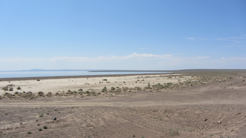 18. Juli. Nach einem Frühstück mit Brot, Marmelade und Kaffee ging es weiter. Wir nahmen die neue Asphaltstraße in der Annahme sie wäre die Fortsetzung der Nordroute, doch falsch gedacht, sie führte uns weiter südlich den Chjargas Nuur entlang. Aber egal, am Ende des Sees gibt es laut Karte eine Piste, die uns wieder auf die Nordroute bringt. So schön der Asphalt ist, so öde erscheint die Fahrerei, kaum Abwechslung durch die Landschaft. Dann kommt der See in Sicht, gar nicht schlecht und er bietet anscheinend den einen oder anderen Strand. Sogar so etwas wie einen kleinen Badeort haben wir passiert.