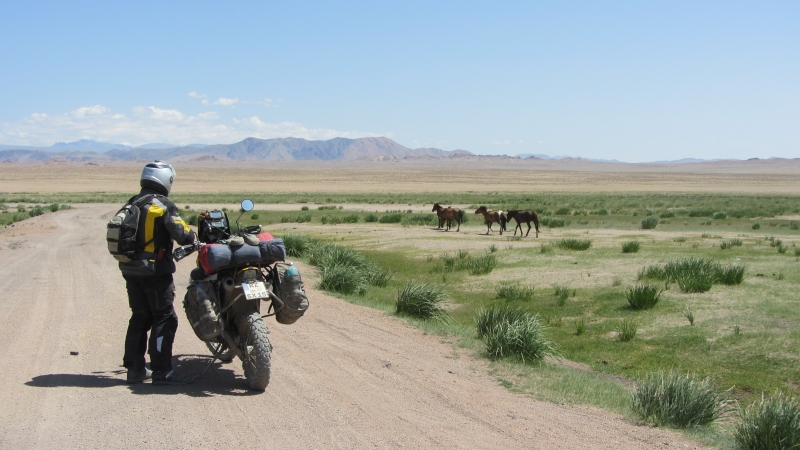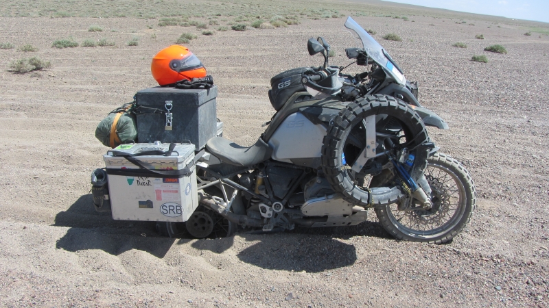 Soweit hat sie sich ganz gut geschlagen, aber ist letztlich wie die GS von John eigentlich zu schwer für diese Pisten. Weiter geht’s, wir entscheiden uns für eine Piste und stellen schnell fest, dass Navigation in der Mongolei nicht ganz ohne Tücken ist. Wir haben uns nämlich für die falsche Piste entscheiden. Zum Glück können wir mit einer kurzen Querfeldeineinlage den Fehler korrigieren. Dann queren wir ein Flusstal und es wird sandig. Zum Glück geht das ganz gut und wir haben Glück, es gibt eine Brücke anstatt der erwarteten Furt :-)
