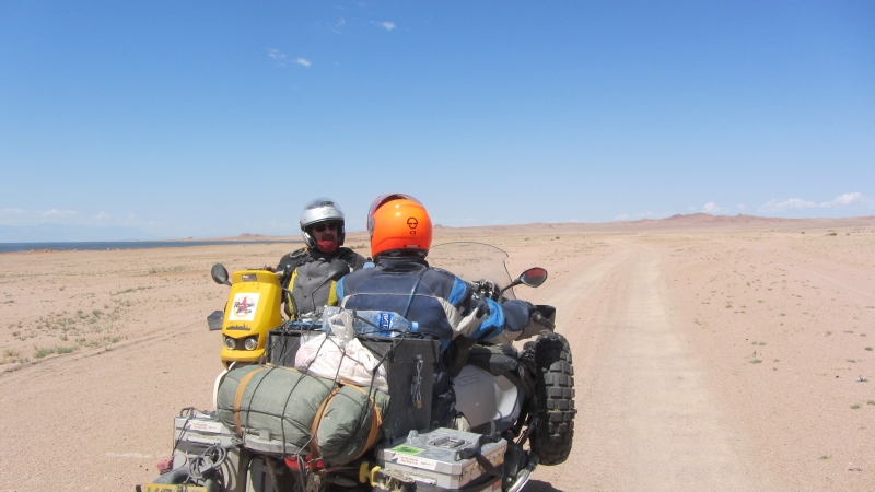 Es geht von Olgii gen Norden, am Achit Nur See vorbei über Hotgor und Burgastay nach Ulangom. Schon in der Stadt gehen wir auf eine staubige Piste. Die Piste schlängelt sich durch ein Flusstal und lässt sich abgesehen vom Staub recht gut fahren, wir sind so ungefähr mit 40-50 km/h unterwegs. Nach einer Stunde überholen wir zwei Motorradreisende aus Deutschland, allerdings wegen des Staubes ohne anzuhalten. Dann geht es aus dem Flusstal hinaus auf eine Ebene. Hier teilt sich die Piste in vier Arme und ein Schild mit verschiedenen Ortsnamen soll wohl Reisenden den richtigen Weg weisen. Uns hilft das jedoch nicht viel. Während wir noch rätseln haben die Beiden Reisenden aufgeschlossen. Also werden jetzt erst einmal Erfahrungen und das Woher und Wohin ausgetauscht. Für mich interessant ist, dass eine XT1200Z mit von der Partie ist.