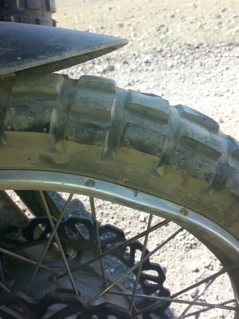 Jetzt wird es felsiger und die Piste ruppiger, wir queren ein großes Geröllfeld, was wohl im Frühjahr verdammt viel Wasser führt. Auch der Lkw taucht wieder auf und ist viel zügiger unterwegs als wir, der Anhänger springt nur so rum, aber das stört den Fahrer nicht. Aber an Johns Felge kann man ablesen, wie ruppig die Piste ist...