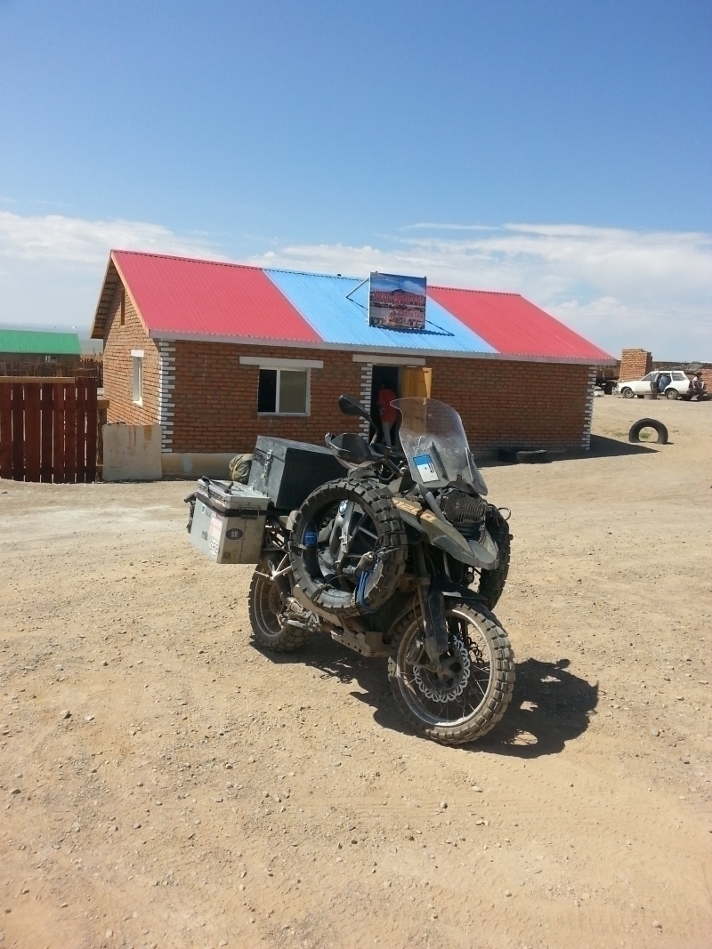 Also versuchte jeder von Uns wieder die beste Spur für sich zu finden. Was gar nicht einfach war, oft hatten wir die Wahl zwischen tiefem Sand, Waschbrett und Waschbrett. Aber irgendwie kamen wir dann doch voran. So gegen Drei am Nachmittag hielten wir an einer Art Kaffee, sprich ein Haus, ein Ger und ein paar Schuppen. Als wir anhielten kam ein Mongole auf uns zu und lud uns in das Ger ein. Es gab Tee und dann machten wir deutlich, dass wir etwas zu Essen haben wollten.