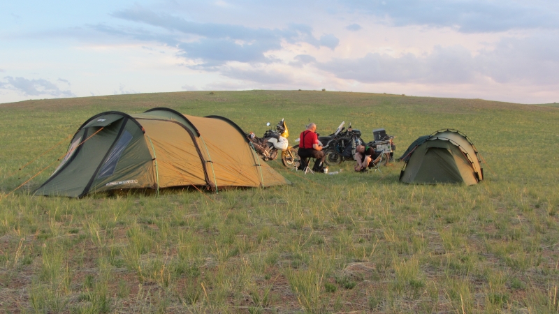 Wir treiben unsere Moppeds über den Pass und erreichen schließlich die A16, die Hauptstraße der Nordroute. Wobei Hauptstraße hier nur bedeutet, die Piste ist doppelt so breit und es gibt etwas mehr Verkehr. Noch ein oder 2 Stunden erreichen wir die Abzweigung nach Ulangom, die Straße ist sogar geteert, eigentlich schade, aber andererseits nach gut sieben Stunden Pisten eine willkommene Abwechslung. Ulangom empfängt uns mit einer Mautstation... Okay, wir zahlen 500 Tugrik pro Mopped und dürfen in die Stadt. Erst einmal Vorräte aufstocken, weil wir Campen wollen, dann tanken und weiter geht es. Als wir aus der Stadt raus fahren empfängt uns eine perfekte Asphaltstraße, der wir zunächst folgen. Da es schon spät ist entscheiden wir uns für ein Ger Camp, das an einem malerischen Fluss liegt. Letztlich eine gute Entscheidung und wir können gleich mit dem Kochen anfangen. Doch als Erstes gibt es einen Kaffee.