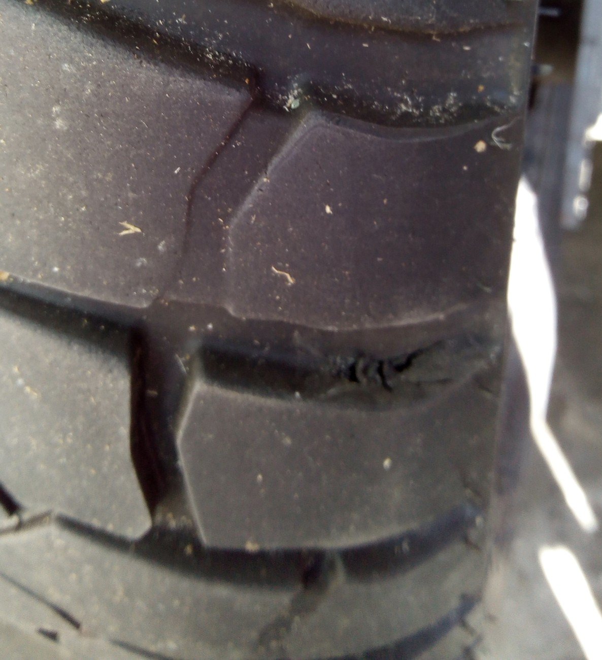 Nach 15600 Km muß getauscht werden. Vorn wären noch ca. 2 Tkm, hinten ca. 1 Tkm zu fahren. Hinten allerdings sind ein neuer (großer) Schaden und mehrere kleine „Einstiche“ gesichtet. Der alte Schmiß hat kaum Veränderung erfahren. Der „neue“ geht schräg zwischen Block und Karkasse ca. 5 mm rein. Will den nicht weiter benutzen.