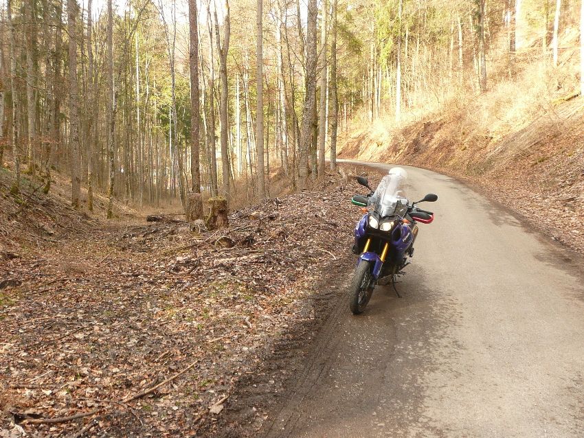 ? Kann nur ein Bild von einem schmalen Waldweg bieten hinunter zu einem Ort, den garantiert auch Helmut nicht kennt: Sondernach. Ich mußte das Licht anlassen, damit ich nach ... das Mopped wieder gefunden habe