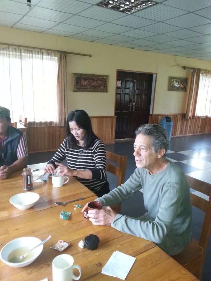 Doch zunächst gibt es Frühstück. Es gibt Milchreis, etwas Brot und heißes Wasser, das ein bisschen nach Tee schmeckt. Dann bietet uns der Hausherr eine Art Instant Kaffee an, was uns dazu bringt, unseren Mac-Kaffee zu holen, der dann von Allen mit Freude angenommen wird.