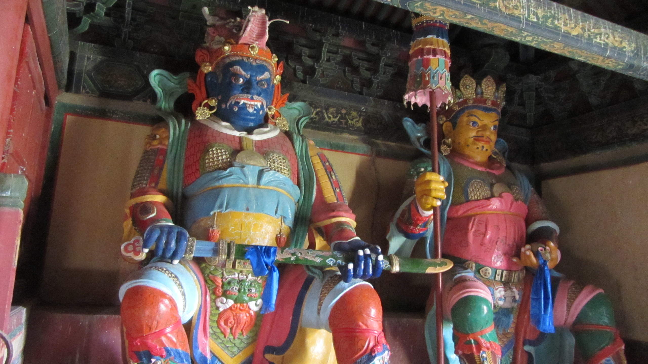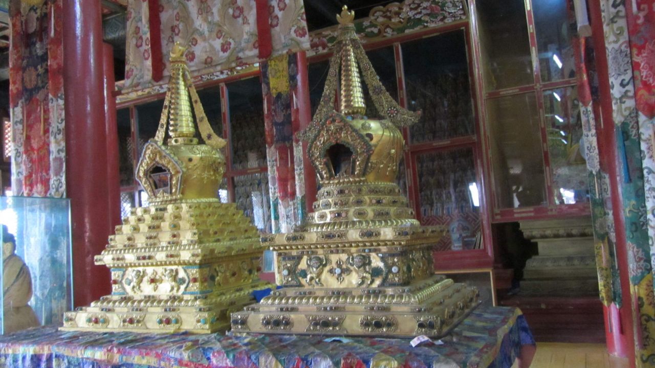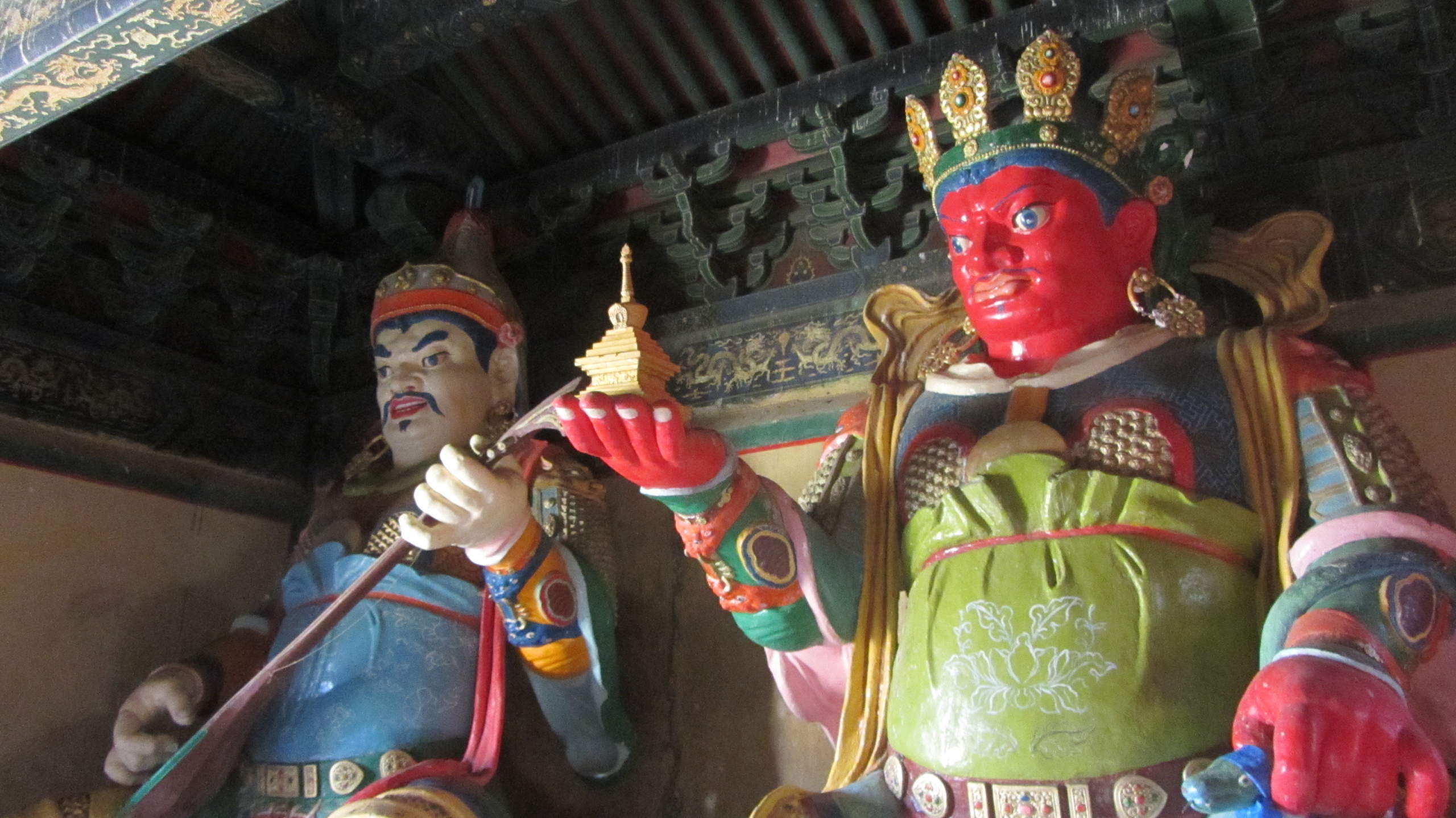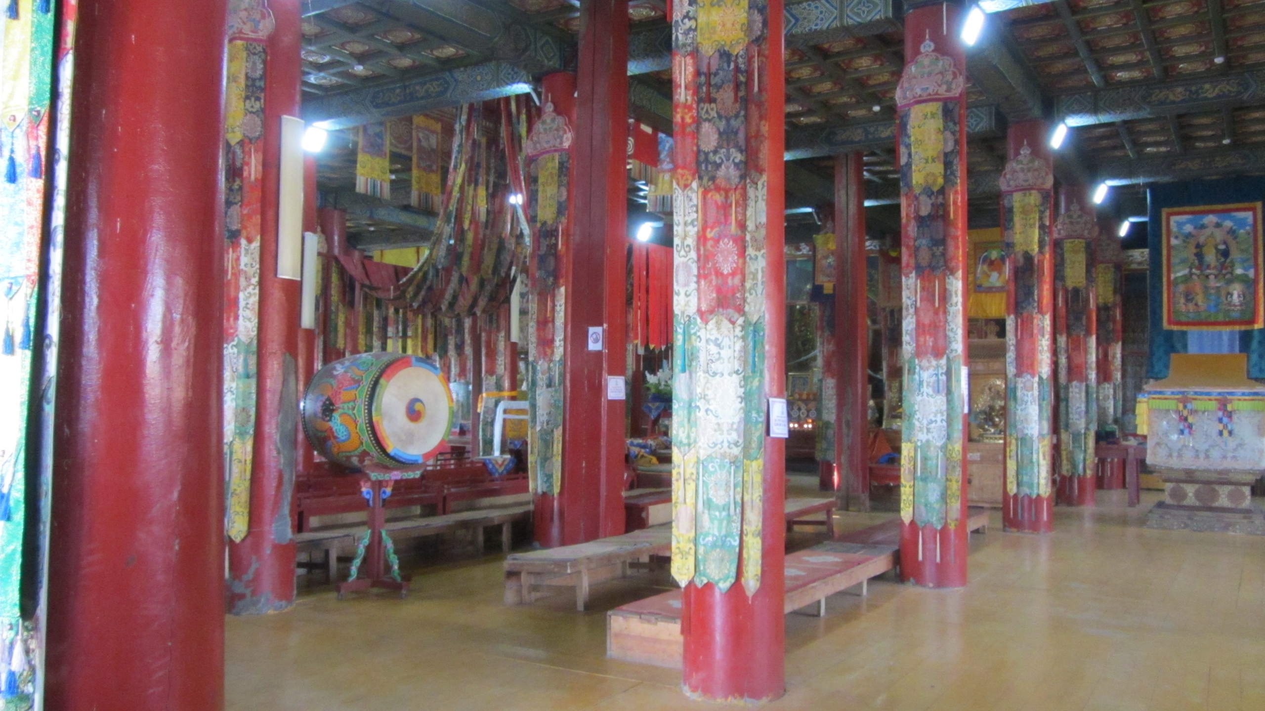 Dann geht es weiter Richtung Kloster. Die Piste dorthin ist mal wieder richtig offroad, allerdings sind Thom und ich irgendwie unkonzentriert, so geht es bei uns relativ langsam voran, während John mit gutem Speed voraus fährt. Am Kloster parken wir die Moppeds und gehen rein. Ein wirklich prachtvolles Kloster, besonders die Malereien und Götterfiguren machen richtig Eindruck. Im Hauptgebäude dürfen wir als Ausländer Eintritt abdrücken, was ich als okay empfinde. Ein paar junge Mönche oder wie soll ich sagen, Mönchslehrlinge drücken sich herum und passen wohl auf uns Touristen auf.