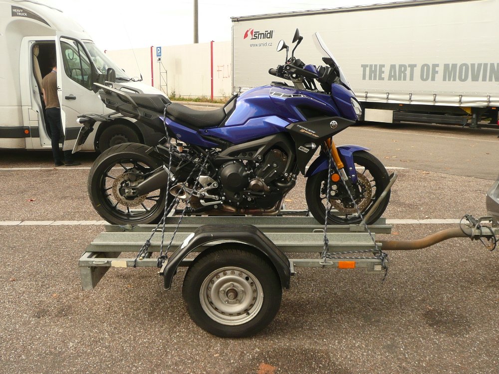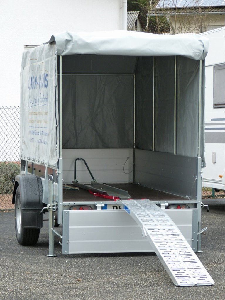 Hier mein Trailer. Ein Brenderup 2060 mit leicht abnehmbarem Planenaufbau und Windschräge. Passt für alles, wenn's keine 2 Mopeds auf einmal sein müssen. Gebremst, 1.000 kg Nutzlast, leer nur 300 kg. Mit Radstoßdämpfern und 100 km/h Zulassung für schlappe 1.700 €.