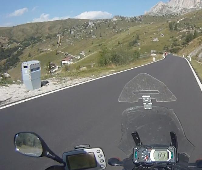ich wollte heute eigentlich einen Video vom Giau schneiden, dabei ist mir aufgefallen, dass da neben der Straße zweimal so komische Kisten stehen. Beim Bild-für-Bild-Schauen habe ich dann erkannt, dass das festinstallierte Radarfallen sind.