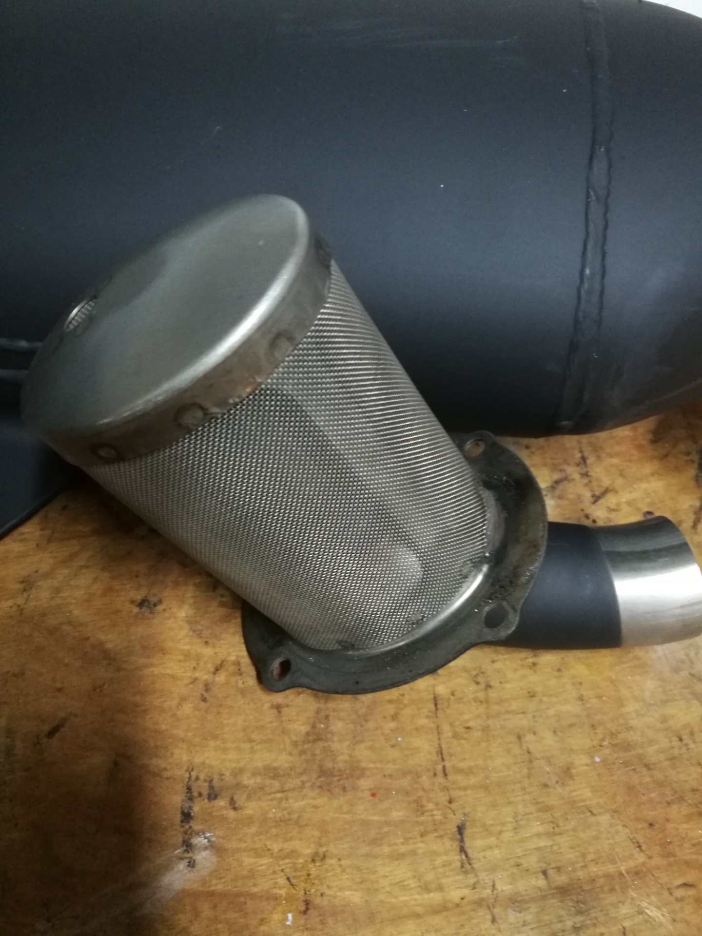 Spaßeshalber habe ich mir aber mal den jungfräulichen Original Topf zur Brust genommen und begonnen, das Ding zu zerlegen, um mir das Innenleben genauer anzusehen. Ich habe jetzt den „Einsatz“ oder db Eater oder wie auch immer das Teil korrekt heißt in den Händen und frage mich, ob soundtechnisch noch etwas „optimiert“ werden könnte. Nicht falsch verstehen, ich möchte keine Brülltüte daraus basteln und meine Mitbürger damit quälen, aber als alter „Bastler“ finde ich das eine interessante Aufgabenstellung.