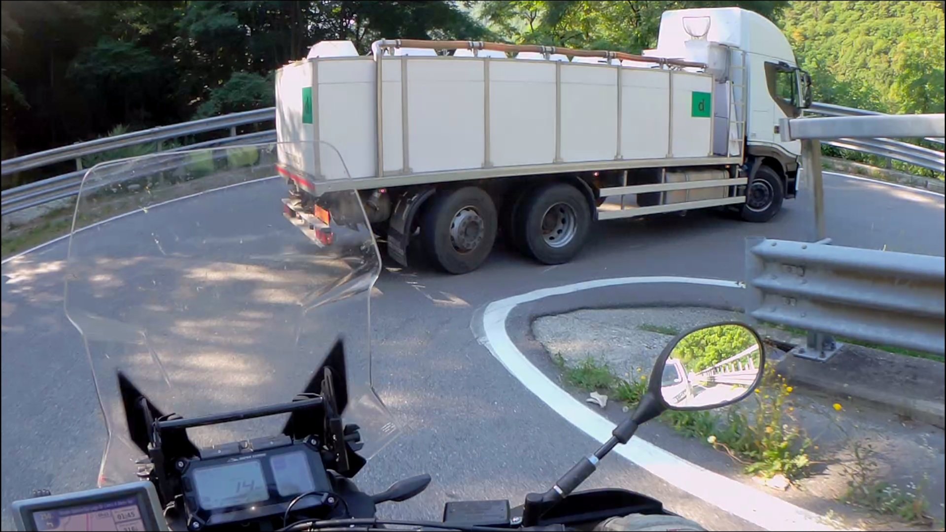 Am Splügen bin ich hinter einem LKW gefahren, der mit lebenden Fischen in einem Tank beladen war. Der hat die Rechtskurven auch immer ganz links angefahren und kam nach der Kurve auch ganz links raus.