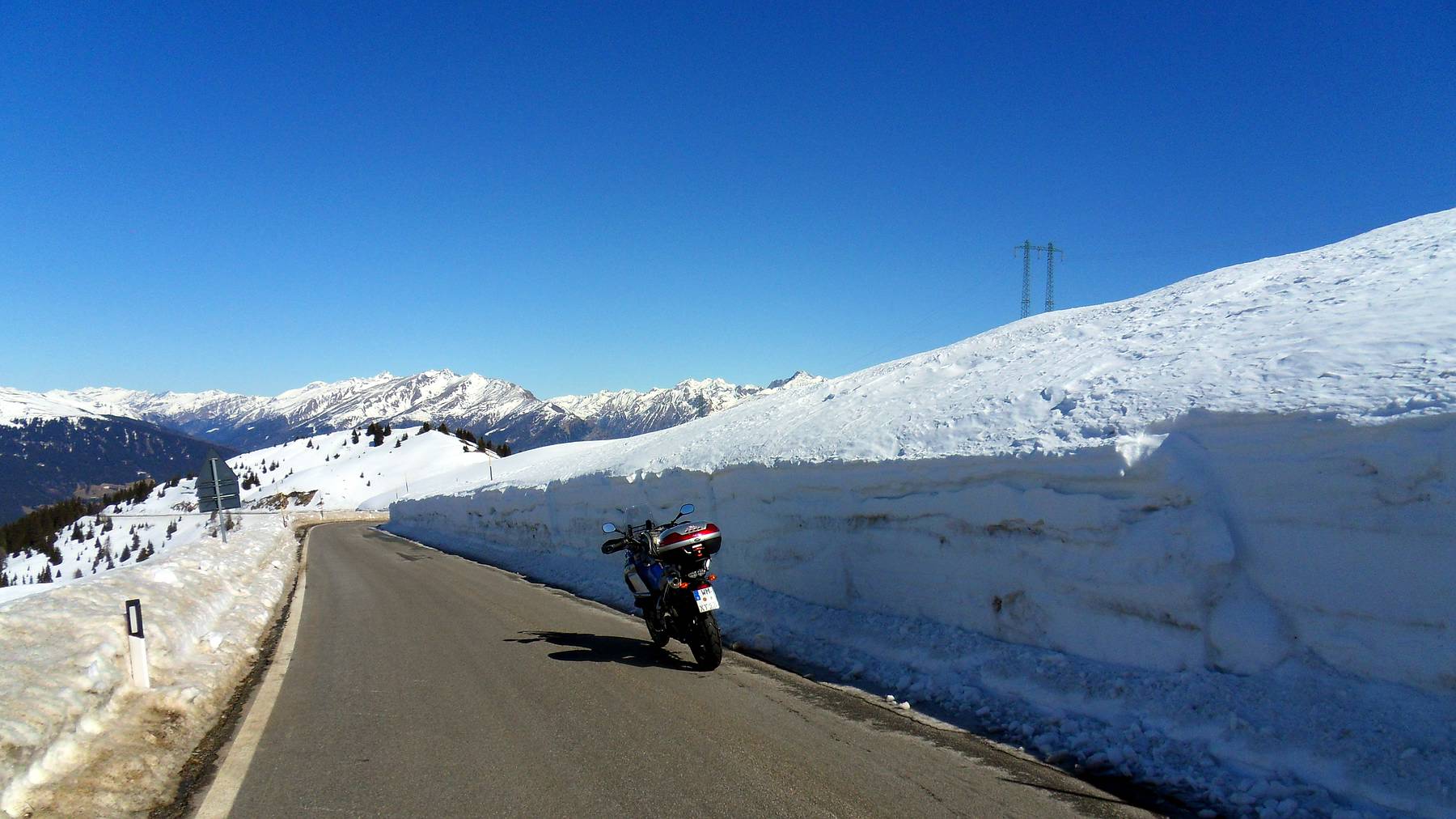 Ansonsten bei dem Wetter kann man ja nicht zu hause bleiben. Straßen in Austria waren Schnee frei nur bisschen Split am Brenner nen Cappo und weiter zum Jaufen in Sterzing schon 21° ganz oben an Jaufen immerhin noch 16° und keine Wolken zu sehen. Das mit dem Schmelz Wasser war nicht so wild da ist die Kiste wenigstens wieder sauber geworden