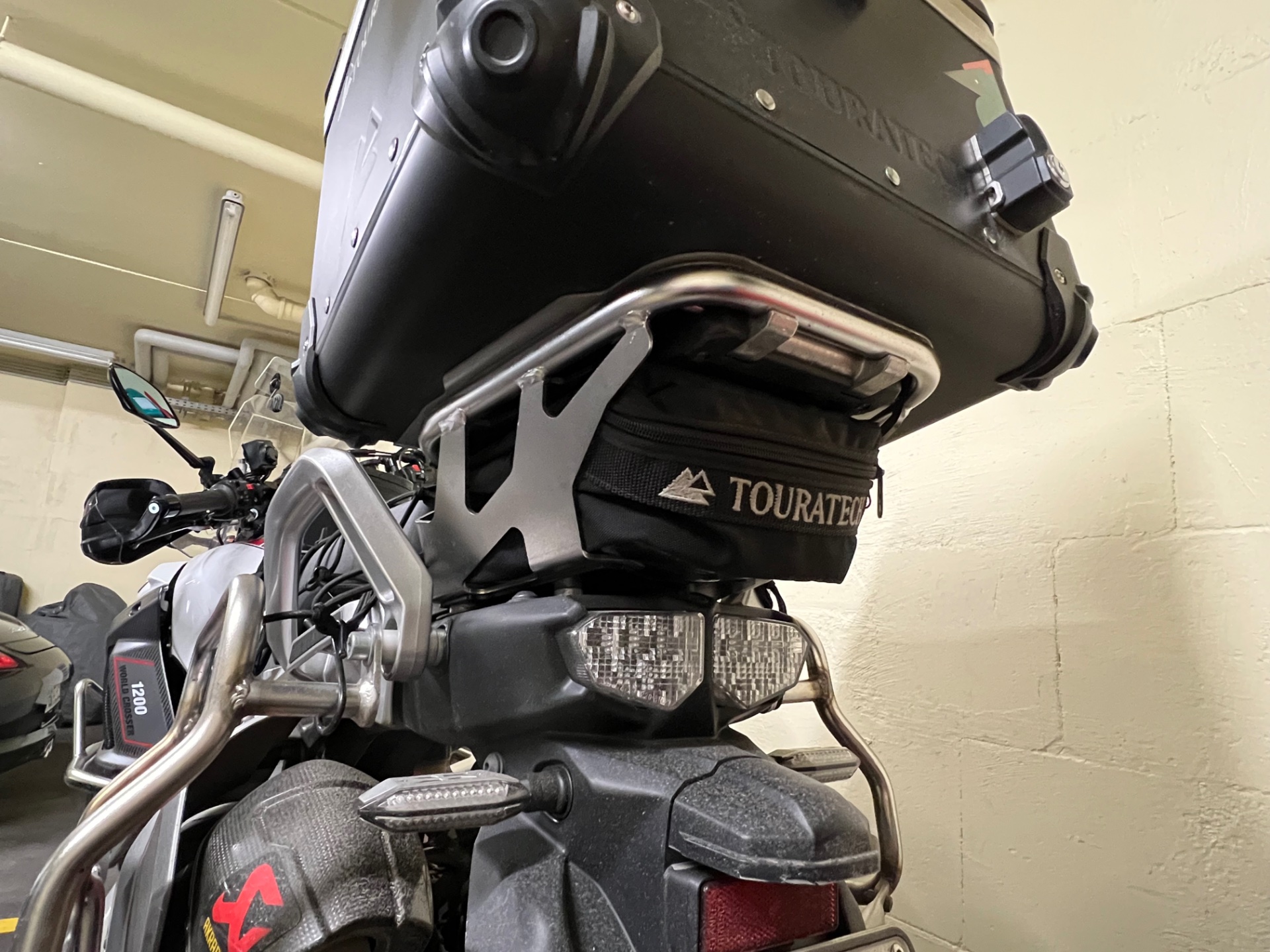 Ich hatte noch das Glück die Tasche welche unter dem Topcaseträger sitzt, gebraucht zu ergattern. Dort ist ein 12V Kompressor verstaut.