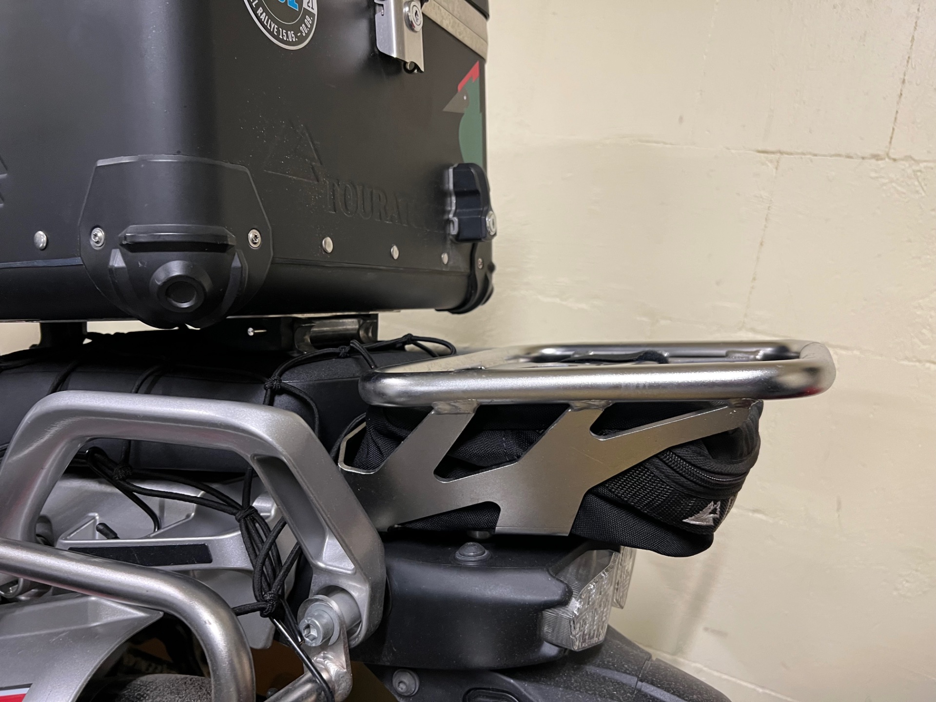 Da ich meist ohne Koffer und nur mit Topcase fahre, hat das bei mir zur Mischlösung geführt: