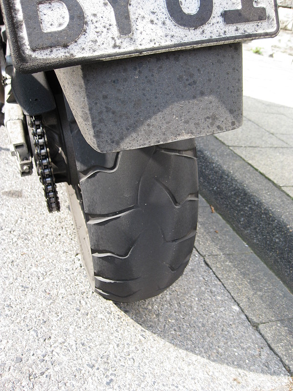 Auf der Vara nach ca 9000km warfen die Sägezähne sogar Schatten (für die Kritiker: ich wollte den Reifen auf der Tour wechseln weil abgefahren, bekam aber nirgends einen BW, also fuhr ich durch nach Hause). Etwas geschockt war ich damals als ich nach einer Alpentour (bzw ca 150km Autobahnfahrt) nach einer Pinkelpause auf meine Vara zuging und diesen Vorderreifen (Battlewing) sah.