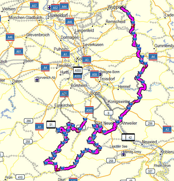 über AB bis kurz vor Bad Neuenahr 135km, dann durch die Eifel und zurück über Land durchs Bergische