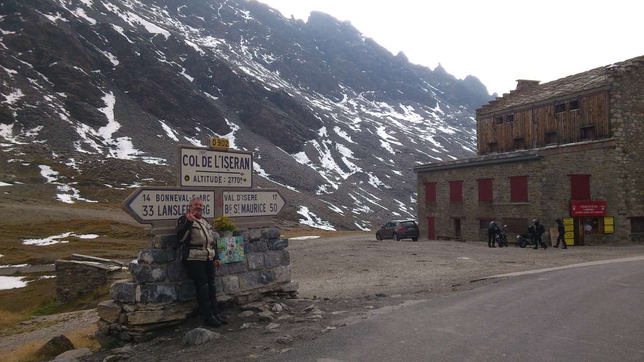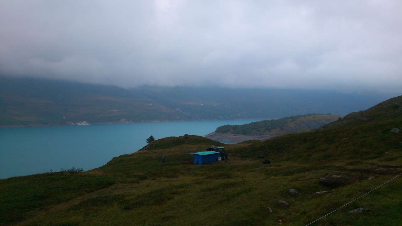 Aber sobald wir von der Autobahn runter waren und zum großen Sankt Bernhard hoch sind spielte das Pendeln keine Rolle mehr. Ein bisschen Eingewöhnung für die Kehren und Serpentinen brauchte ich noch, um mit den Beiden mitzuhalten, aber beim kleinen Sankt Bernhard lief es dann schon richtig flüssig. Die Superdicke Ténéré ist schon ein richtig guter Eckenflitzer! Anschließend gings durch Val d´Isère zum Col de l`Iseran, für mich das erste Mal in Nord-Süd-Richtung. Einfach schönes fahren und mal eine „Abwechslung“ zu meinen bisherigen Alpen-Touren. Anschließend gings in Richtung Col de Mont Cenis. Bei einem kurzen Stopp meinte Mario, er kenne eine schöne Schotterstrecke um den See herum, die wäre ein schöner Einstieg für die Grenzkammstraße. Zwar etwas schwieriger aber an sich auch mit vollem Gepäck gut fahrbar. Warum nicht dachte ich mir und stimmte dem Abstecher zu. Kurz vorm See gings dann rechts runter auf die Piste. Zuerst nur etwas schmaler und gut fahrbar, sogar ein LKW mit einem Bagger auf nem Tieflader kam uns entgegen, Hut ab vor dem Kutscher muß ich sagen! Ein paar Abzweigungen weiter wurde es schon schwieriger, weil leichter Nieselregen einsetzte. Aber der Blick auf den Lac Du Mont Cenis hat mich dafür entschädigt. Aber es kam dicker, die Piste wurde noch schlechter, der Schotter gröber und zu Allem kam auch noch eine störrische Herde Kühe dazu, die den Weg partout nicht mit uns teilen wollte, aber letztlich haben wir uns durchgeschlängelt und weiter gings auf dem immer holprigeren Weg. Dann kamen wir an eine ziemlich steile Steigung…heilige Scheiße… dacht ich noch, als Randsteine lagen grob behauene Steine von gut 1 m Länge, dann eine tiefe ausgewaschene Rinne und der Rest des Belages waren kinderkopfgroße Feldsteine, schön feucht und ziemlich ausgewaschen…aber da düste Mario mit der 1200er schon voraus. Martin mit seiner 660er hinterher. Auf der Hälfte des Anstiegs kippte Martin dann mit seiner Maschine zur Seite. Also erst einmal irgendwie anhalten und ihm helfen. Zum Glück ist ihm nichts passiert und es gab nur ein paar Kratzer an den Koffern. Die Rinne war gute 20 cm tief, vermutlich ist er aufgesessen und dann war die Traktion futsch oder so. Also das Mopped aufrichten, gemeinsam in die Spur setzen und dann wieder losfahren. Das ging dann auch gut und Martin kam heil oben an.