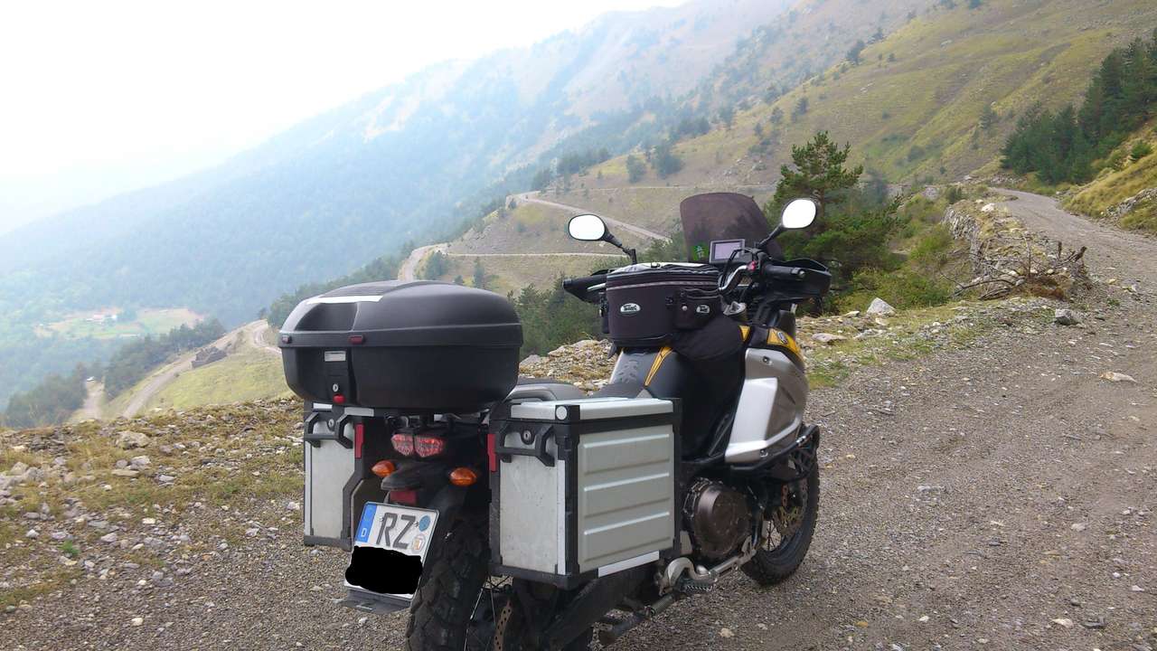 Leider hats durch die Sprünge und Bodenwellen mein Topcase losgerüttelt, die teure Halteplatte von TT hat einfach aufgegeben, aber ein Spanngurt hat dann alles wieder ins Lot gebracht. Später hab ich dann gemerkt, dass die Rüttelei im Topcase auch noch meine Lesebrille und das Weitwinkelobjektiv der Kamera zerlegt hat. Ist eben so, wenn man die Sachen im Topcase nicht komplett einklemmt. Also Morgen ohne Topcase!
