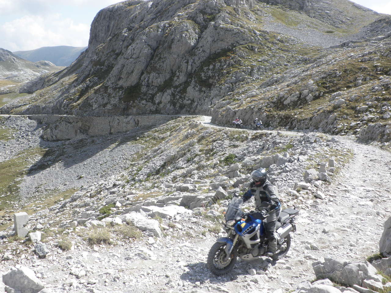Heute wird’s ernst, wir machen die Nordpassage und unsere Guides bereiten uns auf einige sehr anspruchsvolle Passagen vor. Ansage ist, wer sich das nicht zutraut soll Bescheid sagen und er wird entweder über eine alternative Route geführt oder sie fahren das Mopped über diese Passage. Mich stimmt das schon bedenklich, zumal Mario auch noch andeutet, dass es schwieriger wird als dieses harte Teilstück am Mont Cenis… Aber egal, erst mal losfahren und dann sehen wir weiter. Der Anfang ist recht easy, es geht von Triora den bereits bekannten Weg rauf zum Colle de Sanson, von da aus den der LGKS nach Norden folgend. Zu Anfang noch einigermaßen leicht zu fahren wurde es immer schwieriger, der Schotter war lose, so dass das Mopped leicht ins Schwimmen kam, die Kurven teilweise rutschig und eng, dazu dann kopfgroße Steine überall auf dem Weg, die Straße teilweise sehr exponiert, sprich steile Hänge und das Ganze auch noch ohne Randsicherung. Aber einfach genial, die Ausblicke und das Gefühl, ich mach die LGKS mit der XT1200Z! Zum Glück war man viel zu konzentriert, um an den steilen Stellen in den Abgrund zu gucken, die Straße erforderte die volle Aufmerksamkeit und die Dicke wühlte sich richtig gut durch, schön im 2. Gang, Traktionskontrolle auf 2 und den T-Modus einschalten. Den Rest erledigen dann das super Fahrwerk und das mächtige Drehmoment der Super-Dicken. Einfach irre, was das Mopped so abkann und drauf hat! Und jetzt weiß ich auch, warum der Kühler an der Seite sitzt! Außerdem ist die ST das einzige Mopped, was singt, wenn es richtig hart wird. Meine Beschreibung hört sich jetzt vielleicht übertrieben an, aber vergesst nicht, ich sitze auf einem 270 kg Mopped und bin das erste Mal auf so einer heftigen Strecke! Natürlich war nicht die ganze Strecke so aufreibend, aber die einfacheren Passagen waren auch kein glatter Asphalt. Auf Höhe des Passo di Tanarello dann das erste unerwartete Ereignis, an Andys ST platze der Hinterreifen auf den letzten Metern vorm Pass. Genau zwischen zwei Profilblöcken ein gut 5 cm langer Riss. Da war nichts mehr mit flicken oder Schlauch einziehen. Der Reifen war endgültig hin. Zum Glück hatten die Junge von Tenere-Experience-Tours an Ersatzreifen gedacht. Dumm nur, dass sie in Triora lagen. Also schon mal das Rad ausgebaut und den Reifen abgezogen. Dank vieler helfender Hände und der guten Werkzeug Ausstattung kein Problem. Mario sollte dann zurück fahren und mit dem neuen Reifen wieder hoch kommen. Wie gut, dass ich immer einen Satz Strapse dabei habe, so ließ sich der Reifen schnell und einfach hinten auf die Tenere packen. Um nicht mit Allen hier zu warten, wurde die Gruppe geteilt, einige bleiben bei Andy, und Martin und Martin wählten eine alternative Route. Treffpunkt sollte dann zunächst das Refugio Barbera sein und Martin und Martin wollten uns dann am Tende erwarten. Weiter ging´s auf relativ gut zu fahrenden Strecken mit Schotter bzw. Erde durch ein Waldgebiet. Dat tuts auf einmal bei mir einen mächtigen Schlag am rechten Fuß, beim runter gucken vermißte ich im ersten Moment den Fuß, aber der war zum Glück noch dran. Die Fußraste fehlte… Also anhalten und gucken was los war. Ich muß wohl einen dicken Stein aufgewirbelt haben, der dann den Hebel vom Seitenständer verbogen und die Fußraste weggehauen hat. Renè hat dann die Fußraste gefunden, sie war schon angebrochen und hat vom Stein dann den Rest bekommen. Tolle Wurst…Aber zum Glück hat ein Moppe dja vier Fußrasten, also die Soziusraste umgebaut. Dabei hab ich dann auch noch gesehen, dass es den Motorschutz aus der hinteren Befestigung gerissen hat. Dank meinem Multitool, Renés Schweizer Messer und etwas Improvisation haben wir dann Alles wieder hingekriegt. Also weiter fahren. Es war schon etwas komisch so zu fahren, speziell im Stehen, weil die Rast schräg war und leider keine Zähne hatte, aber egal, nur die harten kommen zum Boaire! Naja, vorm Refugio gabs wieder mal ein heftige Schotterpassage… Mann Mann… wenn dann teilweise im Netz zu lesen ist, dass die LGKS ganz easy zu fahren sei mit Gepäck und Straßenreifen muß ich kotzen! Entweder das sind wirklich gute Fahrer oder einfach nur Angeber. Sicher geht das auch mit Gepäck und mit „normalen“ Enduro Reifen, aber ein Spaß ist es dann garantiert nicht, wenn es sich um eine ST oder GS handelt. Okay, von Nord nach Süd ist es etwas einfacher, aber auch noch kein Kindergeburtstag! So, genug gemeckert.