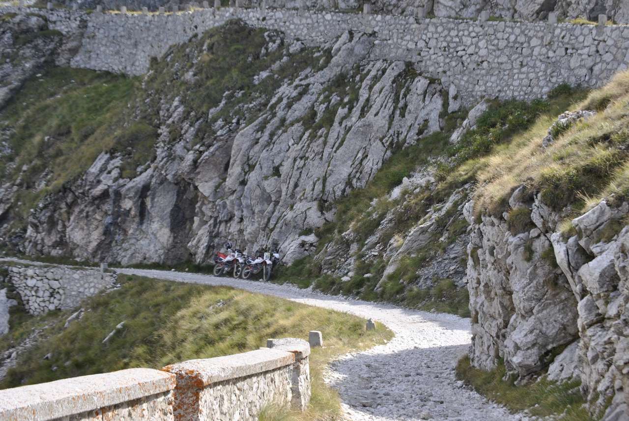 Dann, nach dieser Passage, die Zigarettenpause, das Adrenalin und das Gefühl, ich habs geschafft ist schon echt ne tolle Belohnung, ich würde es immer wieder machen, solange die Straße legal befahrbar bleibt! Wieder auf die Moppeds und weiter geht’s, es ist nicht mehr weit zum Boaire! Claudio ist schon voraus gefahren, um von uns ein paar Fotos zu schießen. Dann, zum Glück ist die Strecke nicht mehr so hammerhart, kommt die Felsnadel vom Boaire in Sicht. Ich glaube, sie ist das meistfotografierte Motiv der Ligurischen und das zu Recht! Einfach atemberaubend! Und dann geht’s um die Nadel herum, bloß nicht in den Abgrund gucken und das Mopped unter Zug halten, die Kehre ist nämlich recht steil und ziemlich grober Schotter liegt da rum… Uff, geschafft und zum Fotoshooting anhalten. Die Beine zittern noch ein bisschen nach von den letzten Anstrengungen, aber dafür gibt’s jetzt jede Menge Glückshormone weil man fast durch ist. Der Ausblick ist phänomenal und auch der Blick in die Tiefe spektakulär. Kein Wunder, dass es der Pass der LGKS ist! Der Ausblick auf die Berge ringsum und die Täler war gigantisch und man muss einfach die Straßenbauer von damals bewundern, auf welch kühnen Trassen sie die Grenzkammstraße in den Felsen gebaut haben.
