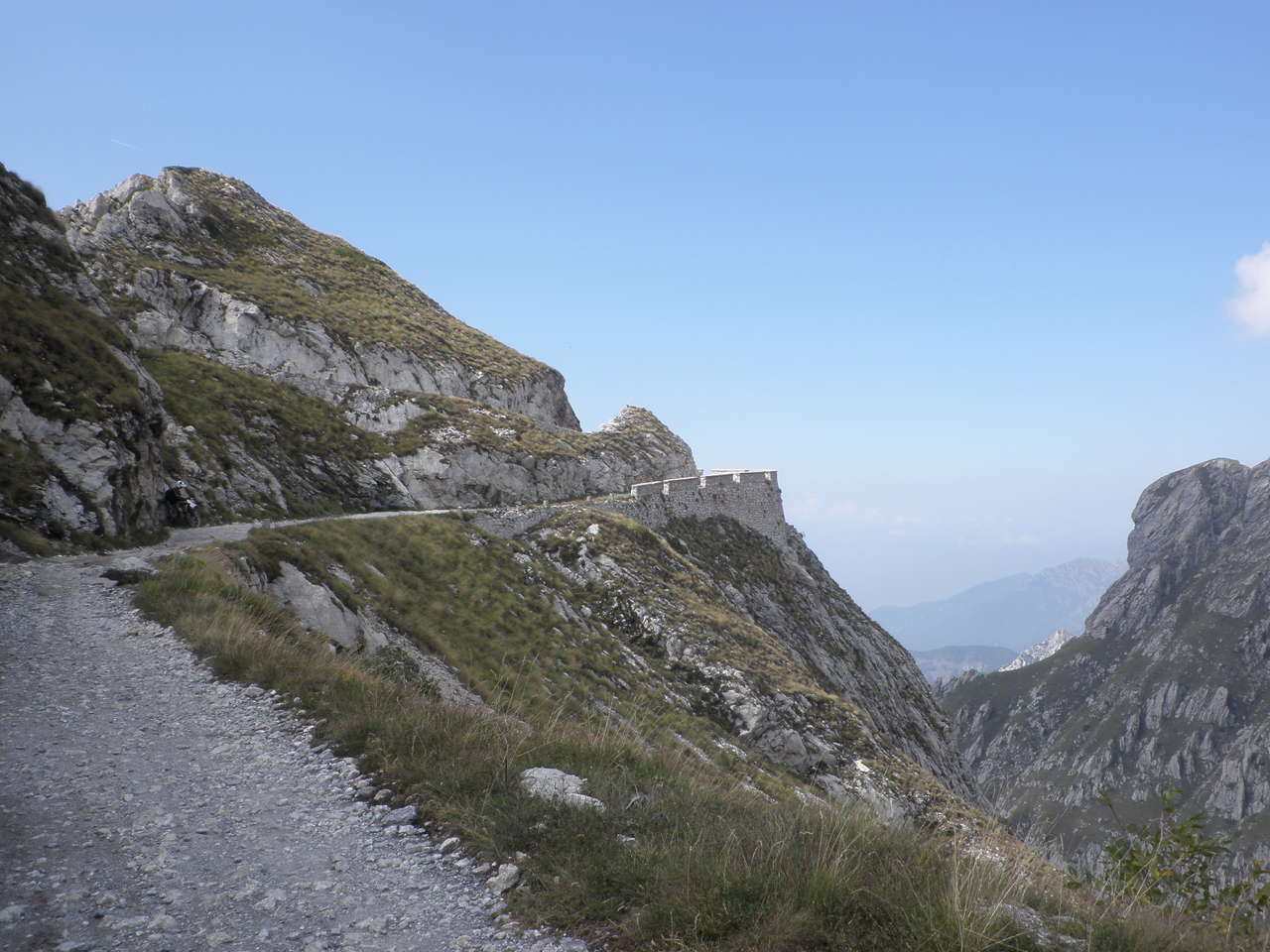 Danach gings dann wieder den Berg runter und noch ein bisschen auf Asphalt, natürlich wieder herrlich kurvig, weiter. Dann links ab und die Schotterorgie konnte beginnen. Wir sind am Südeinstieg der LGKS und schrauben uns langsam auf Höhe. Nach dem ich es zunächst etwas langsamer angehen ließ ging´s dann immer besser und ich hab gelernt, wie man die Dicke über die vielen kleinen Erdwälle fliegen lassen kann. Zuerst dachte ich, diese Wälle dienen der Geschwindigkeitsbeschränkung, aber sie sollen verhindern, dass Wasser die Wege auswäscht, weil sie das Wasser immer zum Hang ableiten. Eigentlich egal, sie sind einfach schöne Sprungschanzen für die Dicke! Überwiegend war die Piste in relativ gutem Zustand, ein paar Passagen waren recht grob geschottert, aber waren noch keine wirkliche Herausforderung, aber Spazierenfahren wars auch nicht gerade. Immer wieder wurden kurze Stopps eingelegt, um die geniale Aussicht zu genießen und ein paar Fotos zu schießen. Das ist einfach eine herrliche Landschaft, vor Allem der ständige Wechsel der Vegetation, eben fuhren wir noch durch den Wald und ein paar Kehren später waren wir dann auf Höhe der Almen. Dazu immer wieder reine Felsformationen. Das ist schon beeindruckend, diese Landschaft.