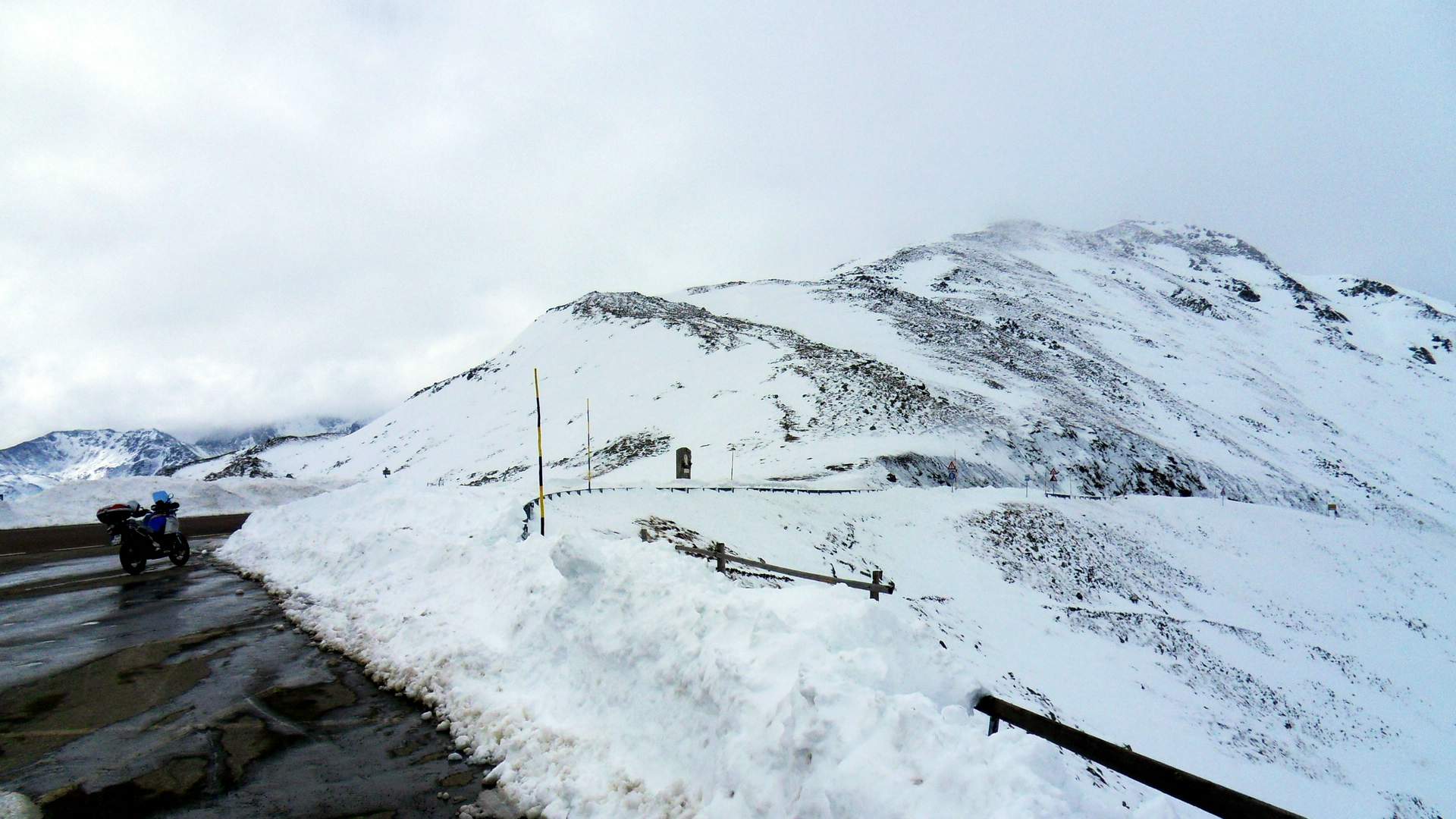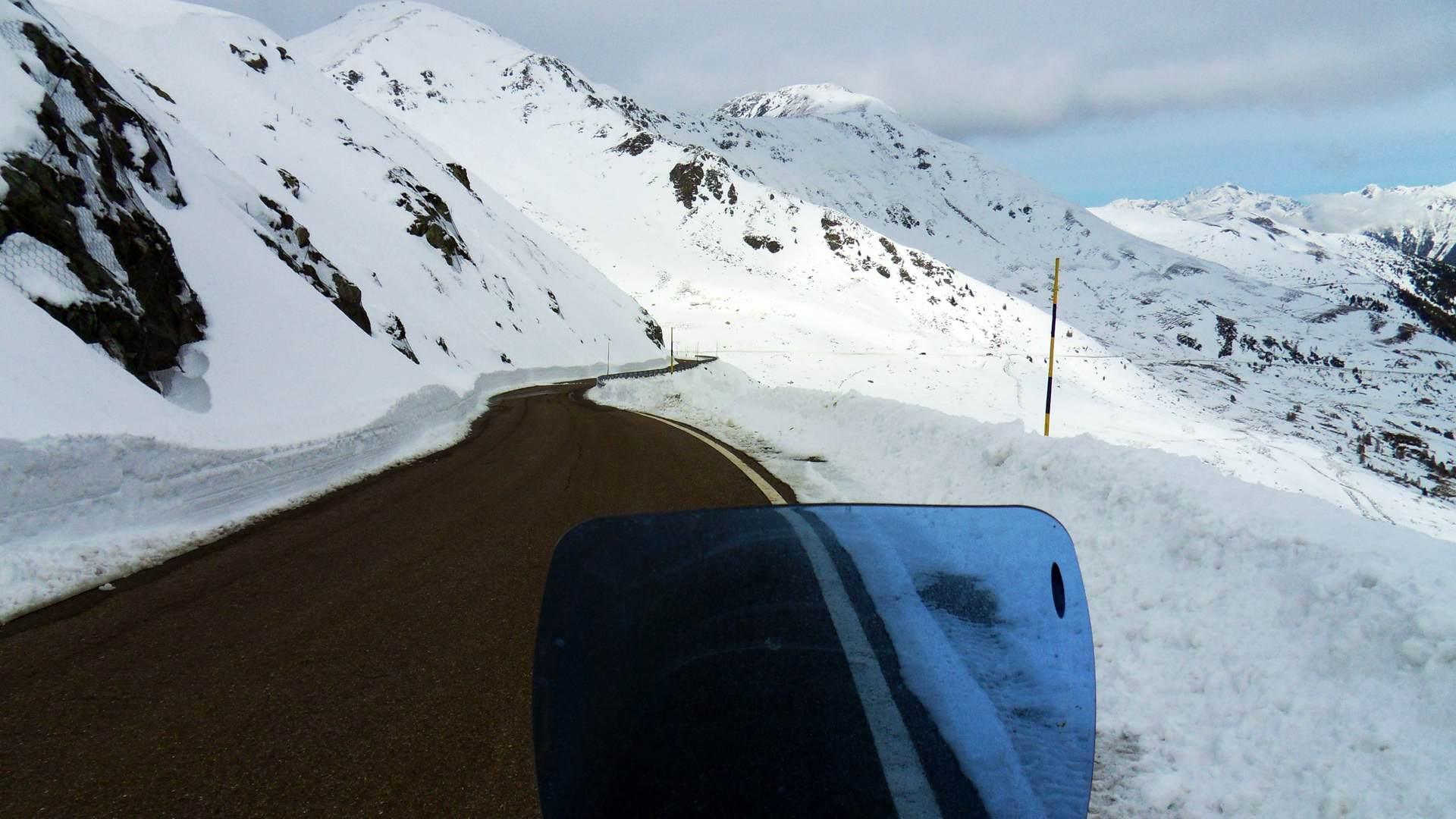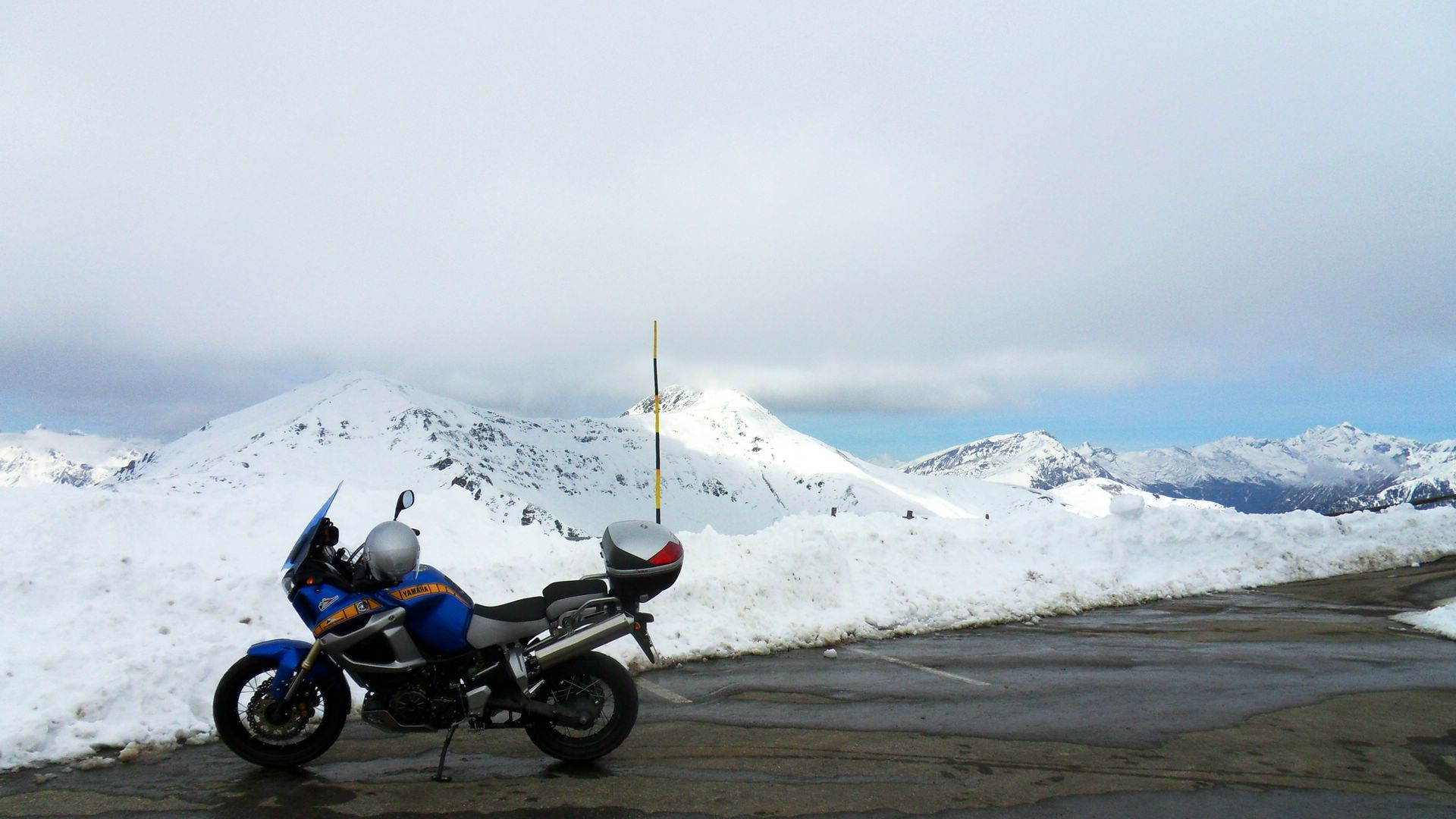 überwunden hatte mittlerweile ists schon fast 11°. Und vor mir liegen gut 350km zum Jaufen jetzt aber ab die Post bei super Wetter abgefahren 17°. In den Bergen hatts schon ein wenig düster aus geschaut und am Seefelder Berg war schon Schnee an den Nord Hängen auf der Brennerstr. ist auch schon fleißig Schnee geräumt worden. Am Brenner nen Cappo und weiter gehts nach Sterzing tolles Wetter ind keine Schneeflocke zu sehen an neuem Kreißverkehr rechts weg und schoon ist die auffahrt zum jaufen in sicht. Unten alles schön grün aber mit jedem Meter sinkt die Temperatur repide, auf halber Strecke gings mit dem Schnee los die Straße wurde auch immer schmäler vor lauter Schnee. Nach einigen Baustellen ,( die Str.wird verbreitet ) an denen die Str. doch sehr verdreckt war verbunden mit der nassen Str.- schmierig!!. Oben angekommen wars 5° und bedeckt. Nix los hier oben die ganzen Knieschleifer sitzen schon am Ofen
