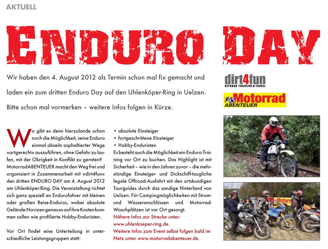 Enduro fahren für alle: Am 7. September 2013 findet der 4. EnduroDay von MotorradAbenteuer und dirt4fun auf dem Uhlenkoeper Ring bei Uelzen statt. Infos und Anmeldung unter dirt4fun.de