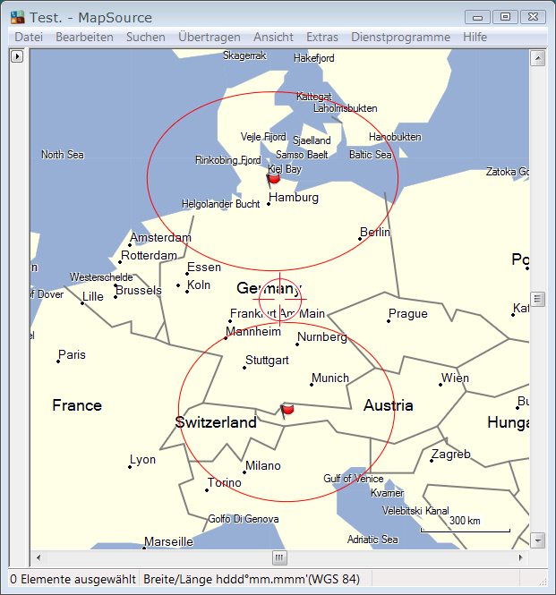 Am besten lässt sich die Verzerrung mit einem Annäherungsalarm darstellen. Habe mal als Beispiel bei Kiel und Namlos einen Alarm gesetzt. Je höher der Breitengrad, desto mehr verzerrt der Kreis. Der Grund liegt darin, dass der Projektionswinkel fix vorgegeben ist, bzw. sich aus dem Kartenmaterial ergibt.