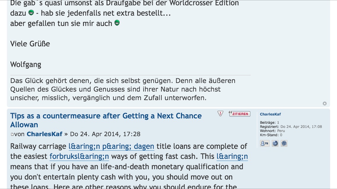 Oha, da sieht man mal, was passiert, wenn man die Registrierungsfragen ändert... Heute hatte ein legitimes Neumitglied bei der Anmeldung bemerkt, dass die Sicherheits-Abfrage nach der PS-Zahl der XT12 das neue Modell nicht berücksichtigt. Daraufhin hatte ich die teils recht speziellen Sicherheits-Abfragen auf allgemeinere Fragen geändert, und ZACK, waren die Spammer da. Wegen eines Meetings habe ich davon nichts mitgekriegt.