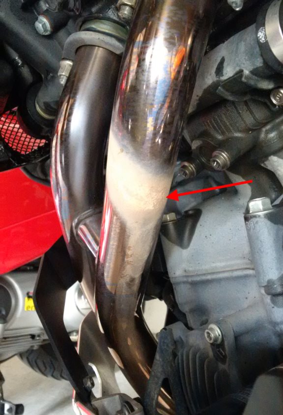 bei meiner Super Tenere, EZ 09/2013, 5tkm gelaufen, Akrapovic ESD, fängt der Krümmer an zu rosten. Ich denke auf dem Foto kann man das Problem deutlich sehen, in dem betroffenen Bereich ist die Oberfläche rau und matt. Der Motor ist übrigens nur feucht vom Waschen, also keine Sorge.