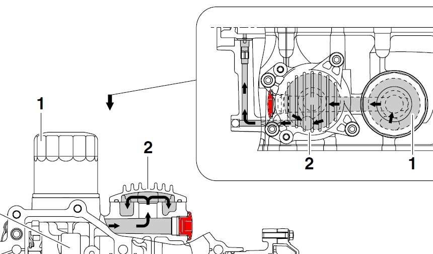 Ich habe die betreffende Schraube rot markiert. Ich würde dir als Laie recht geben, da sich die Schraube nach dem Ölfilter in der Druckleitung befindet, wo sie meiner Meinung hingehört. Eine weitere Möglichkeit wäre die Verwendung eines Adapterringes zw. dem Motor und dem Ölfilter, wie ich es auch schon im