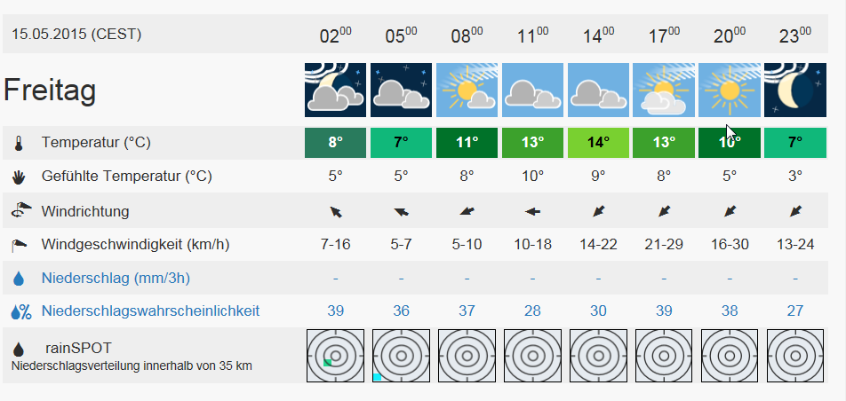 Dann bilden wir die gemeinsame Schnittmenge und einigen uns auf exakt 15,0°C mit rel. Luftfeuchte, die der Jahreszeit entspricht und keinem die Kurzatmigkeit aufdrückt. Niederschlag in flüssiger oder fester Form kann gerne oben bleiben oder in anderen Regionen runterprasseln - homöopathische Mengen von < 1 mm in 3 h mit Wahrscheinlichkeit <10% akzeptiere ich...