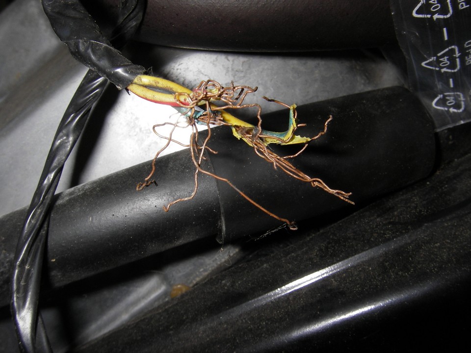 Eingenistet im Batteriefach, einige Kabel angefressen, die Werkszeugtasche komplett verspeist, die Gummiabdeckung des hinteren Zylinders durchlöchert.