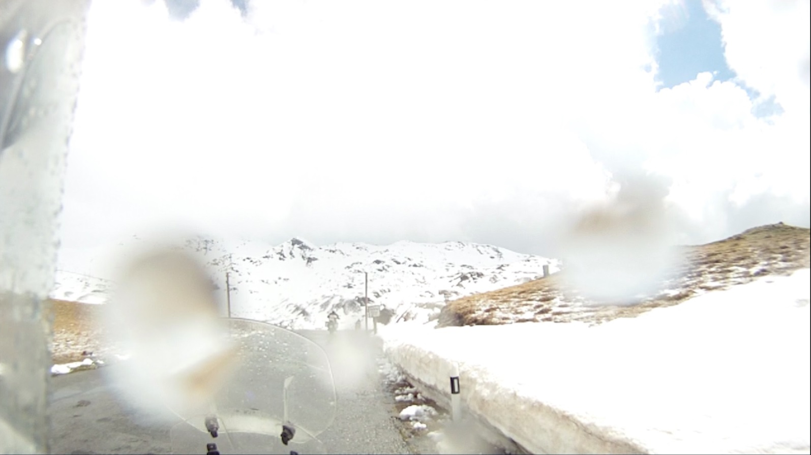 In Santa Maria Val Müstair fängt es wie aus Eimern an zu schütten und wir biegen links zum Umbrailpass ab. Im strömenden Regen fahren wir den Pass hoch (Video kommt noch). Ab 2.000m wird aus dem Regen Eisregen. Auf der Passhöhe sieht man, dass der Schneepflug bereits die Fahrbahn geräumt hat.