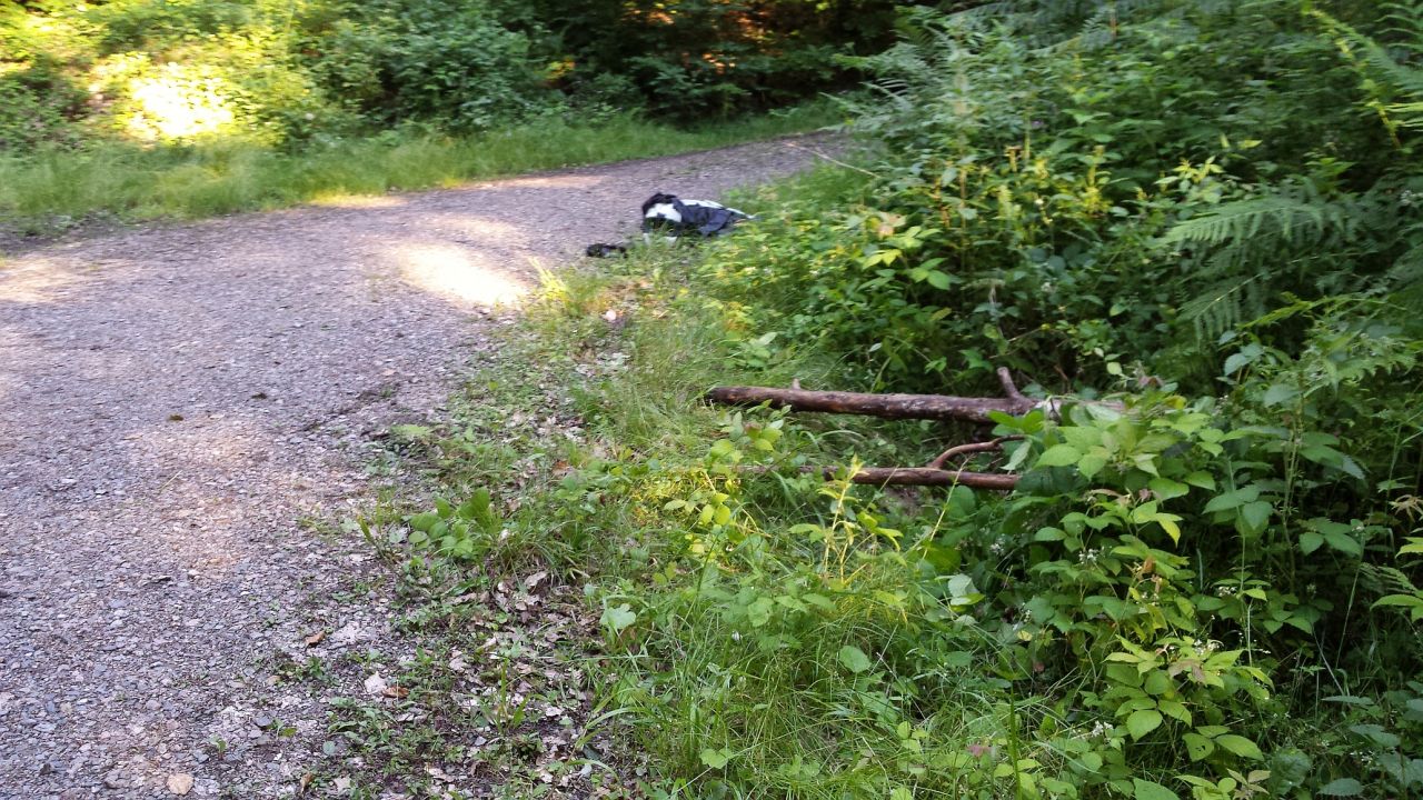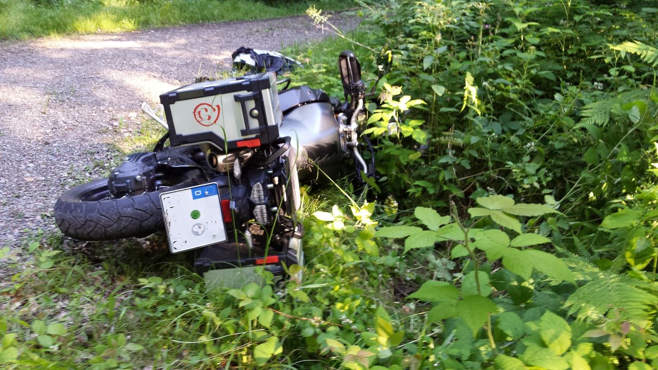 Mit den Ästen habe ich sie ein wenig hochgelagert, weil Benzin ausgelaufen war, bzw. ich die irgendwie als Füßstütze benutzen wollte. Ging leider alles nicht. Somit musste ich zurück an die Straße laufen und einen anderen Biker bitten, mir zu helfen.