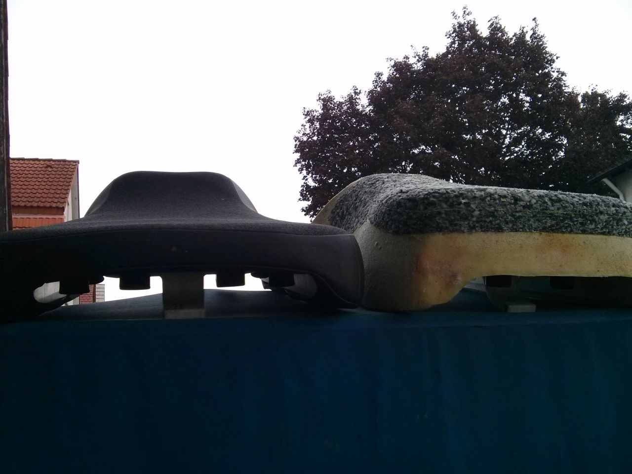 Am Ende war ich glaube so ca. 10 mal bei ihm gewesen. Er hat immer wieder nachgebessert und ich bin eine Proberunde (min. 60 Minuten) gefahren. In dieser Zeit haben wir noch ein paar Änderungen mit aufgenommen die im Vorfeld nicht besprochen wurden. Unter anderem wurde der Sitz um 6 oder 8 cm mehr als geplant aufgepolstert. Am Ende waren wir dann bei 650€.