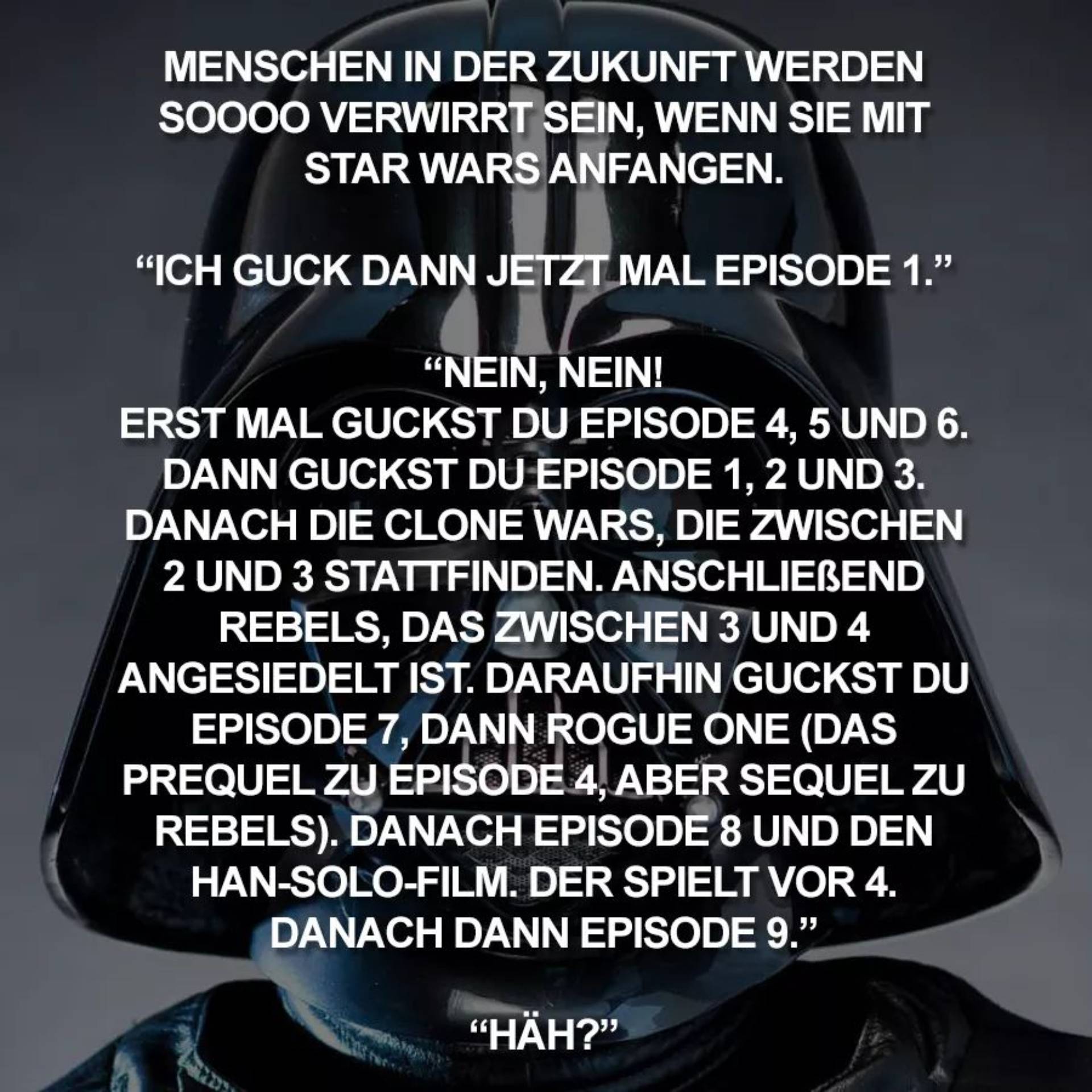 ich habe gestern "Die letzten Jedi" gesehen und heute käst es mich ohne Ende an, dass man nirgends über den Film sprechen darf - "Ey, nicht spoilern!". MANN, wenn Euch der Film wirklich so wichtig wäre, wärt Ihr gestern verdammt noch mal im Kino gesessen!