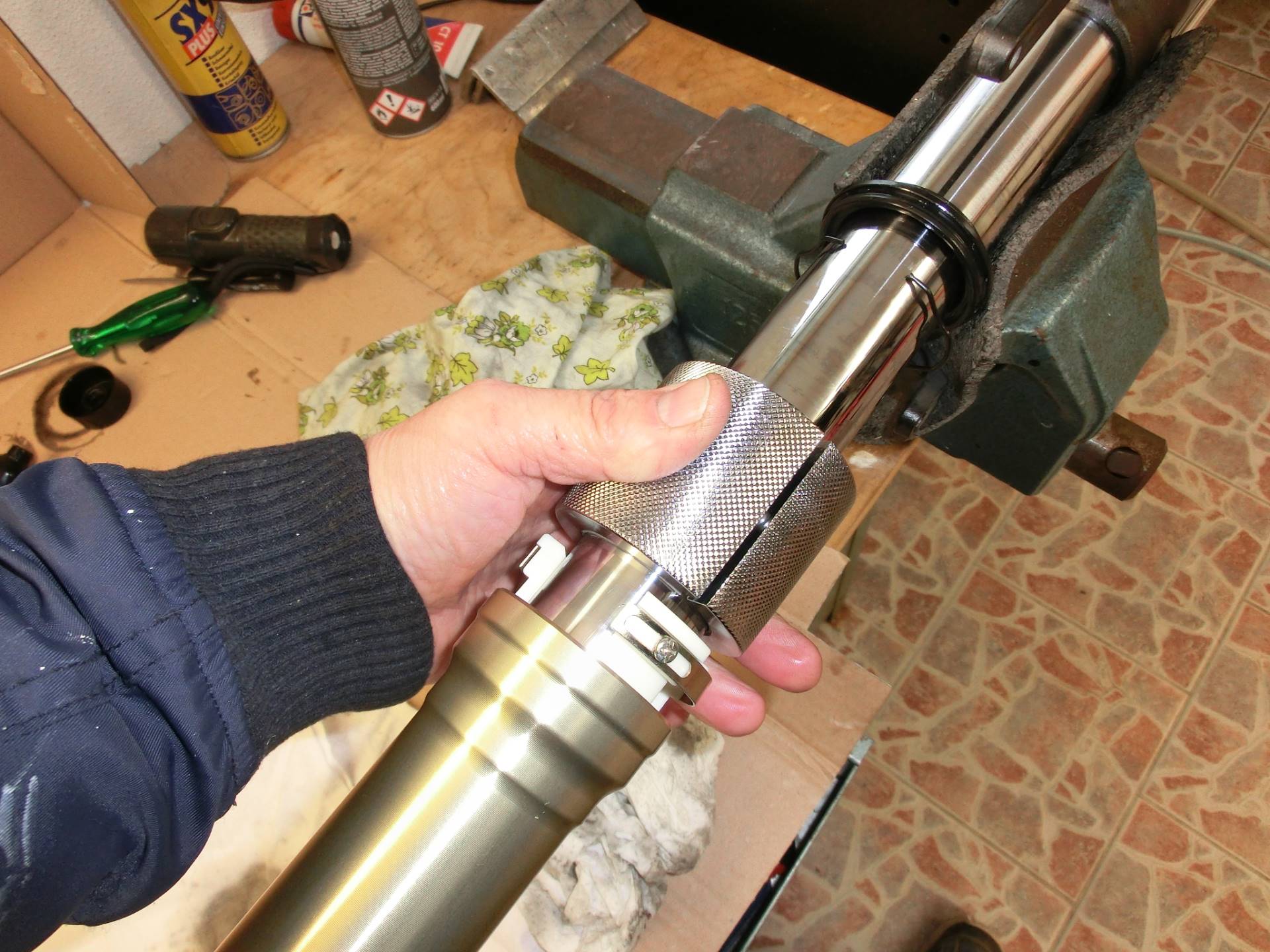 Die obere Veschlusskappe hatten wir ja bereits gelöst, so dass sie jetzt einfach herausgedreht werden kann. Dies geht anfangs etwas stramm, weil die Kappe im Inneren mit einem O-Ring gegen das Standrohr abdichtet.