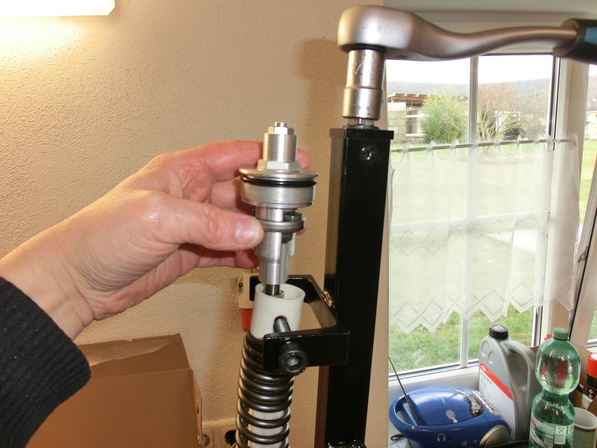 Den Dämpfer von oben in den Gabelholm einführen. Das Haltewerkzeug wie beim Zerlegen wieder ansetzen. Durch den Gabelfuss den Dämpfer wieder festschrauben (neue Kupferdichtung verwenden).