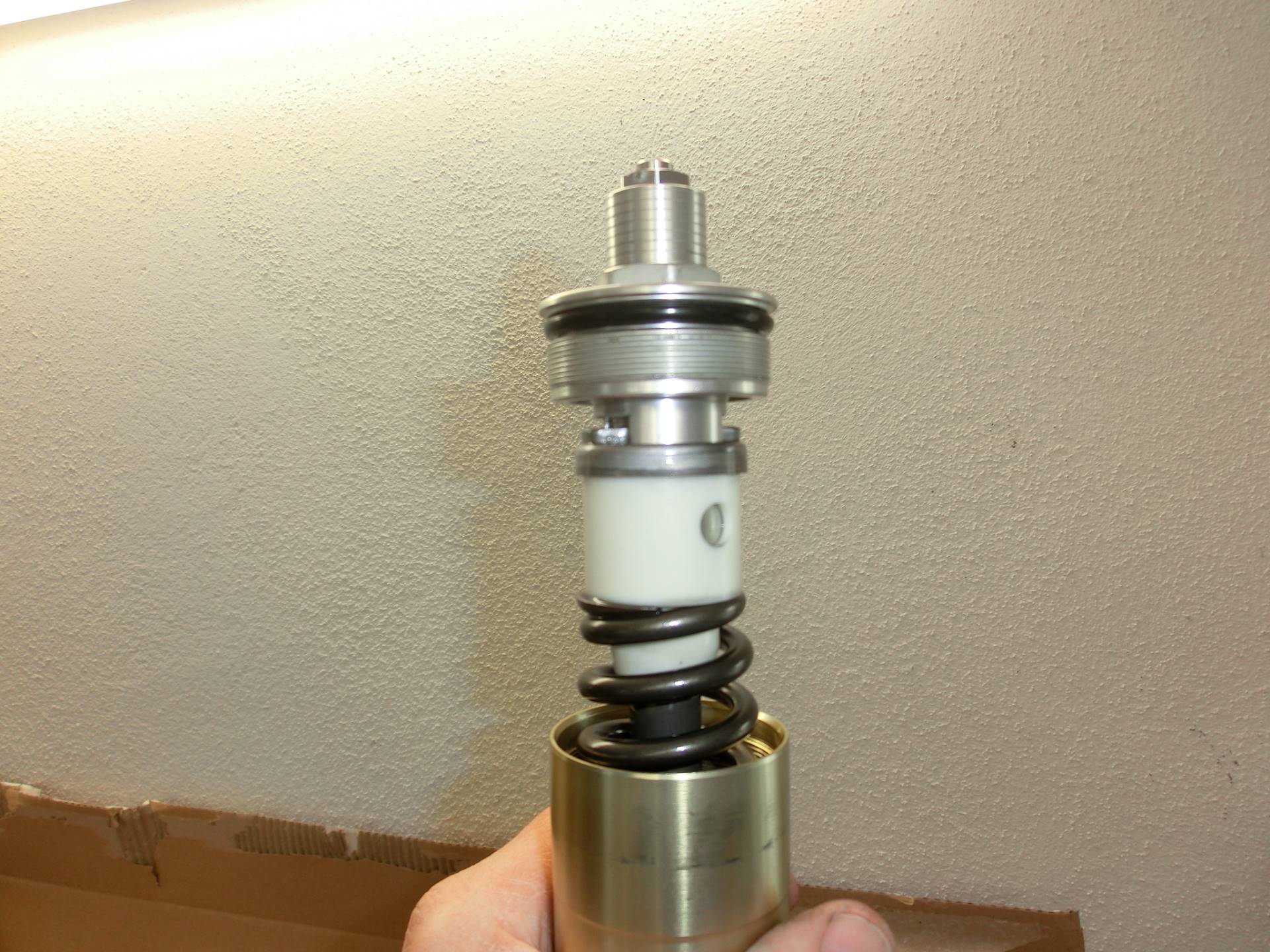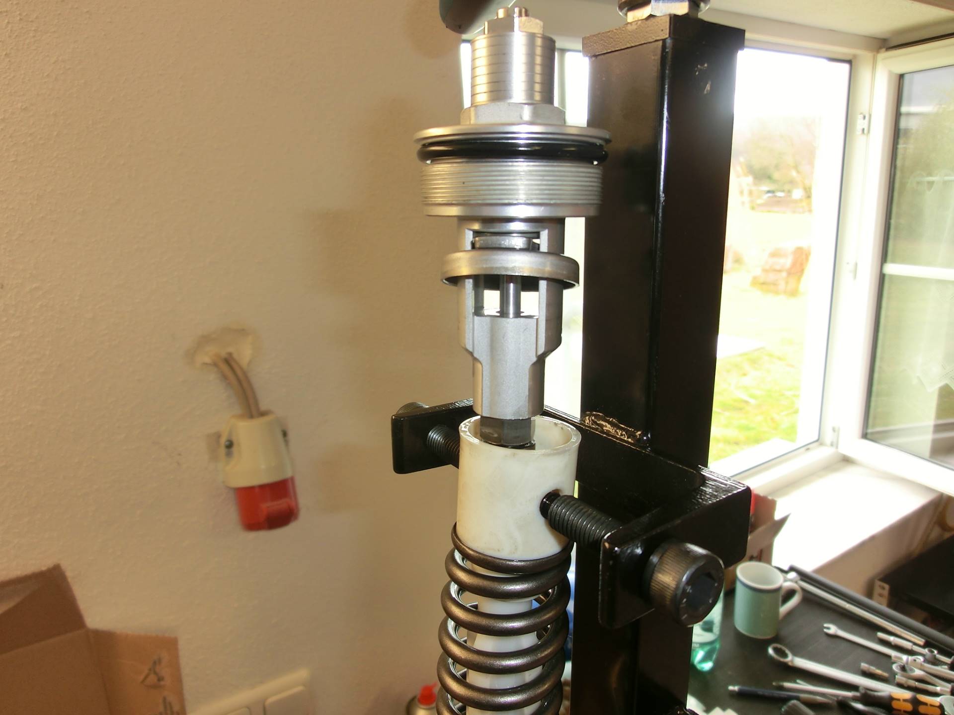 Die Feder stützt sich am oberen Verschlussdeckel ab. Der wiederum ist auf den Dämpferkolben aufgeschraubt und mit einer Mutter gekontert. An die Kontermutter kommt man aber nur ran, wenn die Feder vorgespannt wird und sich dadurch in ihrer Länge verkürzt, so dass der "Hals" des Verschlussdeckels mehr und mehr zum Vorschein kommt.