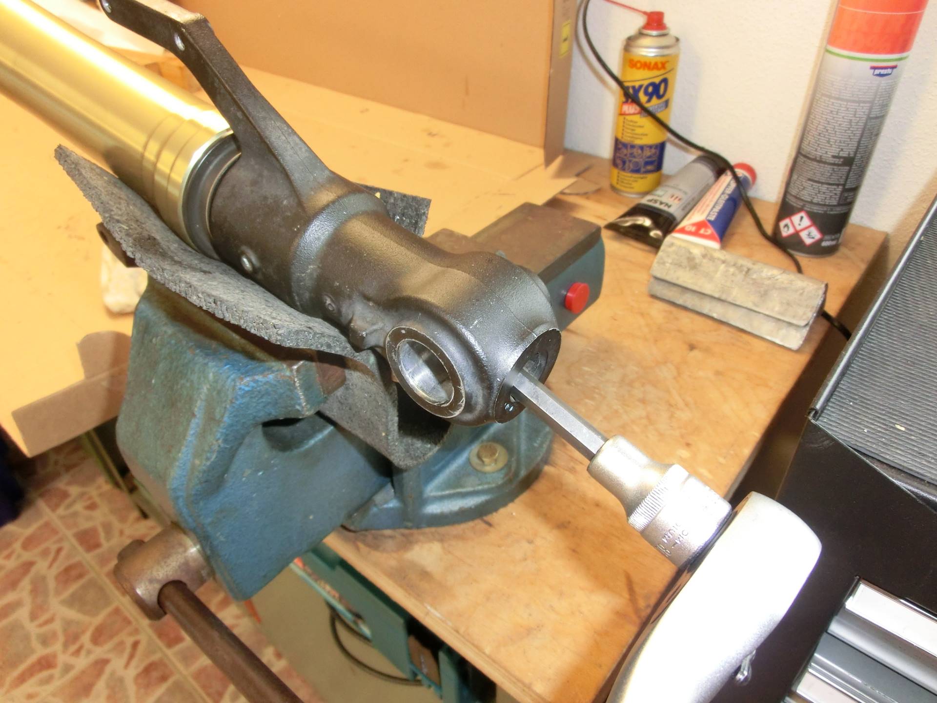 Zur Erleicherung der Arbeit können wir das Standrohr locker in einen Schraubstock spannen. Backen vorher mit einem dicken Gummi belegen, um Beschädigungen des Rohrs zu vermeiden. Und niemals richtig fest zuspannen, sondern den Schraubstock nur als helfende Hand betrachten!
