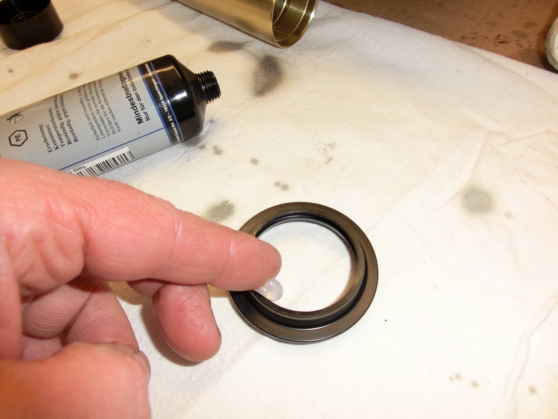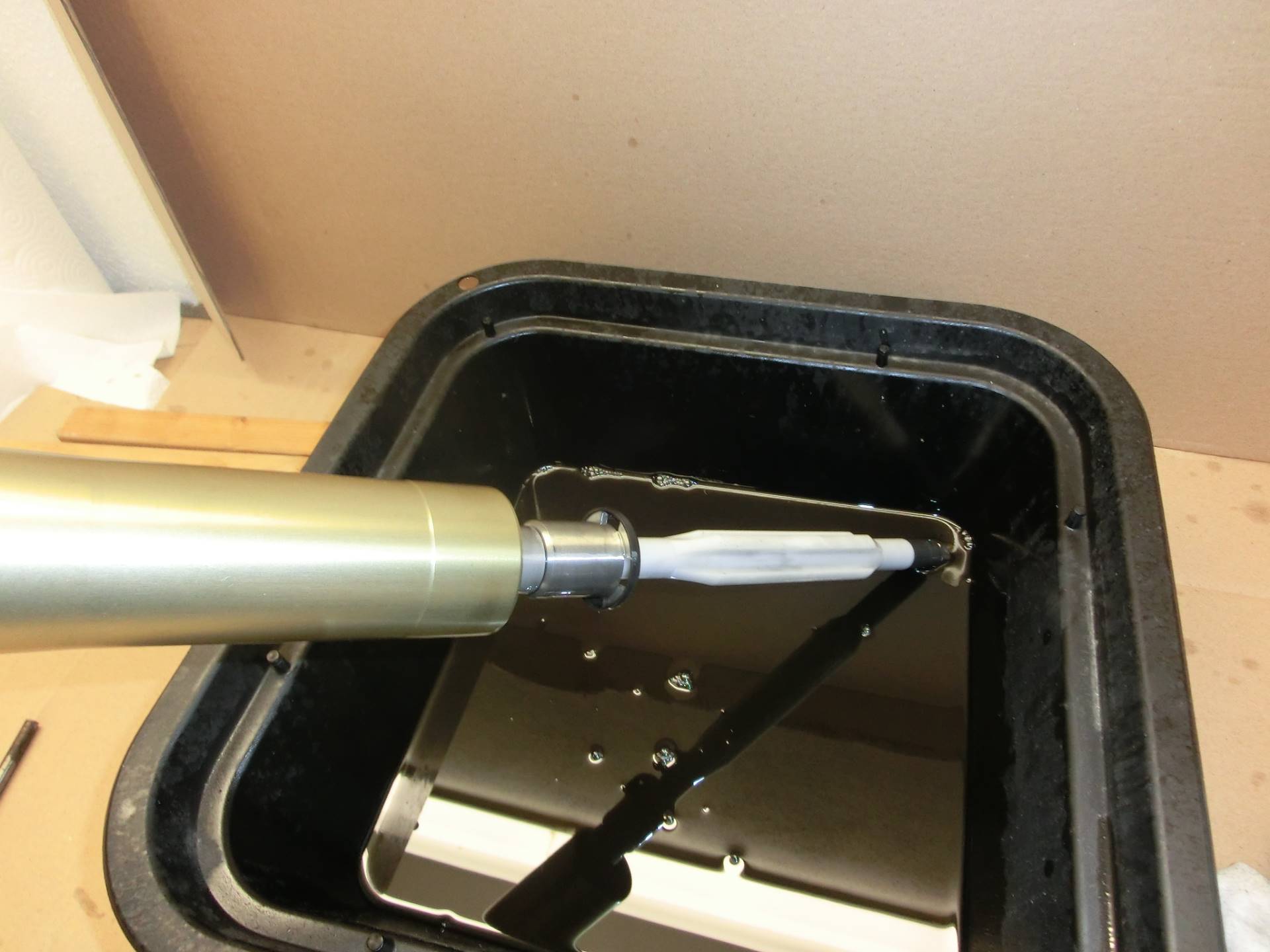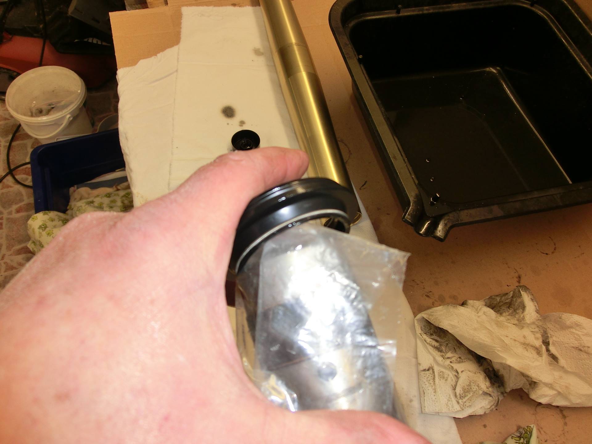 Auch wenn kein Öl mehr zu kommen scheint: es befindet sich immer noch viel Öl im Holm, vor allen Dingen im Dämpfer. Eine vollständige Entleerung ist nur mit weiteren Zerlege-Massnahmen zu erreichen. Alle nachfolgenden Schritte sind also immer sinnvoll oder gar zwingend, wenn eine oder mehrere der eingangs aufgeführten Arbeiten notwendig sind (Federwechsel, Simmerringe, konsequente Wartung, ...).
