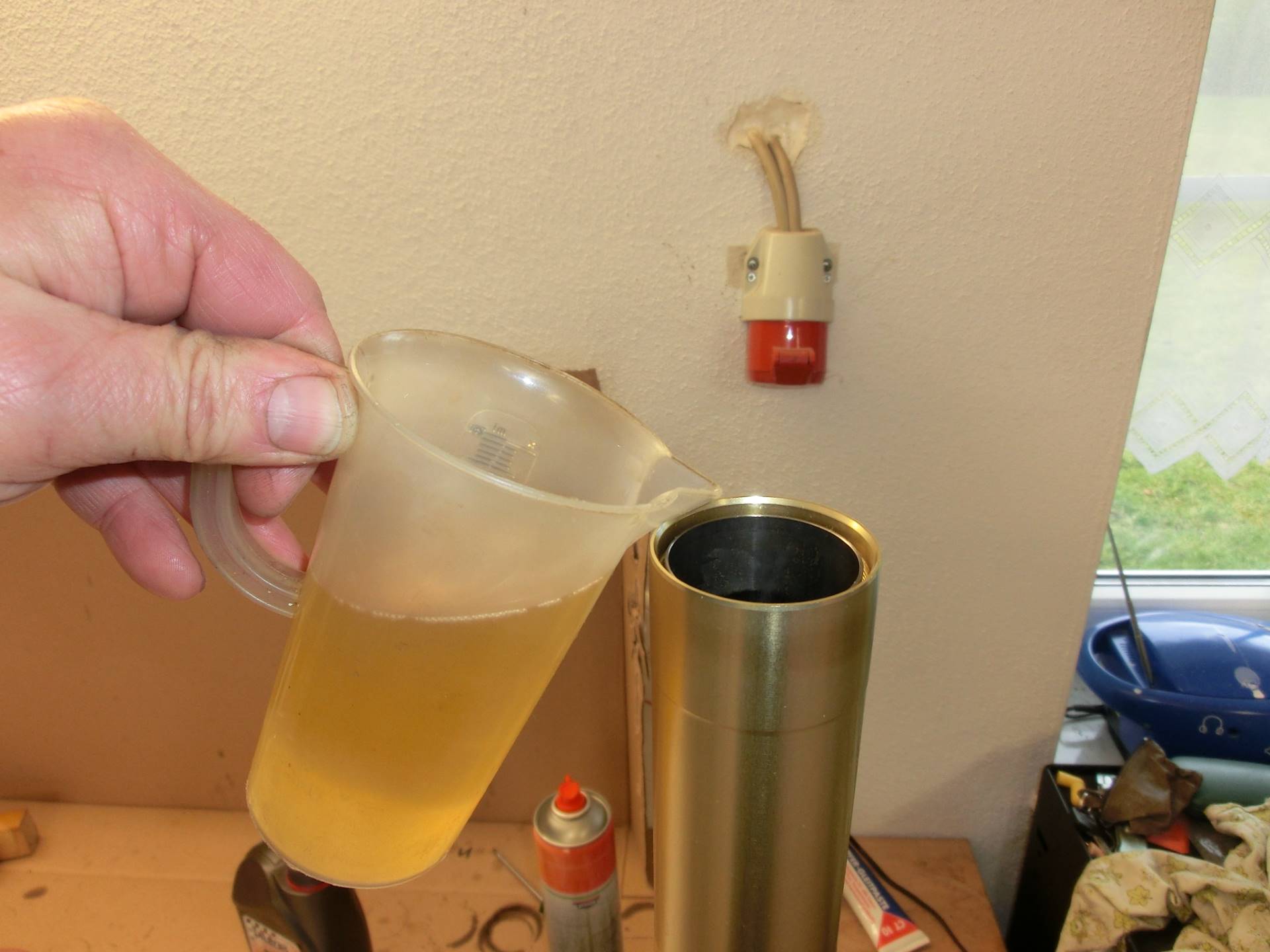 Die obere Veschlusskappe hatten wir ja bereits gelöst, so dass sie jetzt einfach herausgedreht werden kann. Dies geht anfangs etwas stramm, weil die Kappe im Inneren mit einem O-Ring gegen das Standrohr abdichtet.