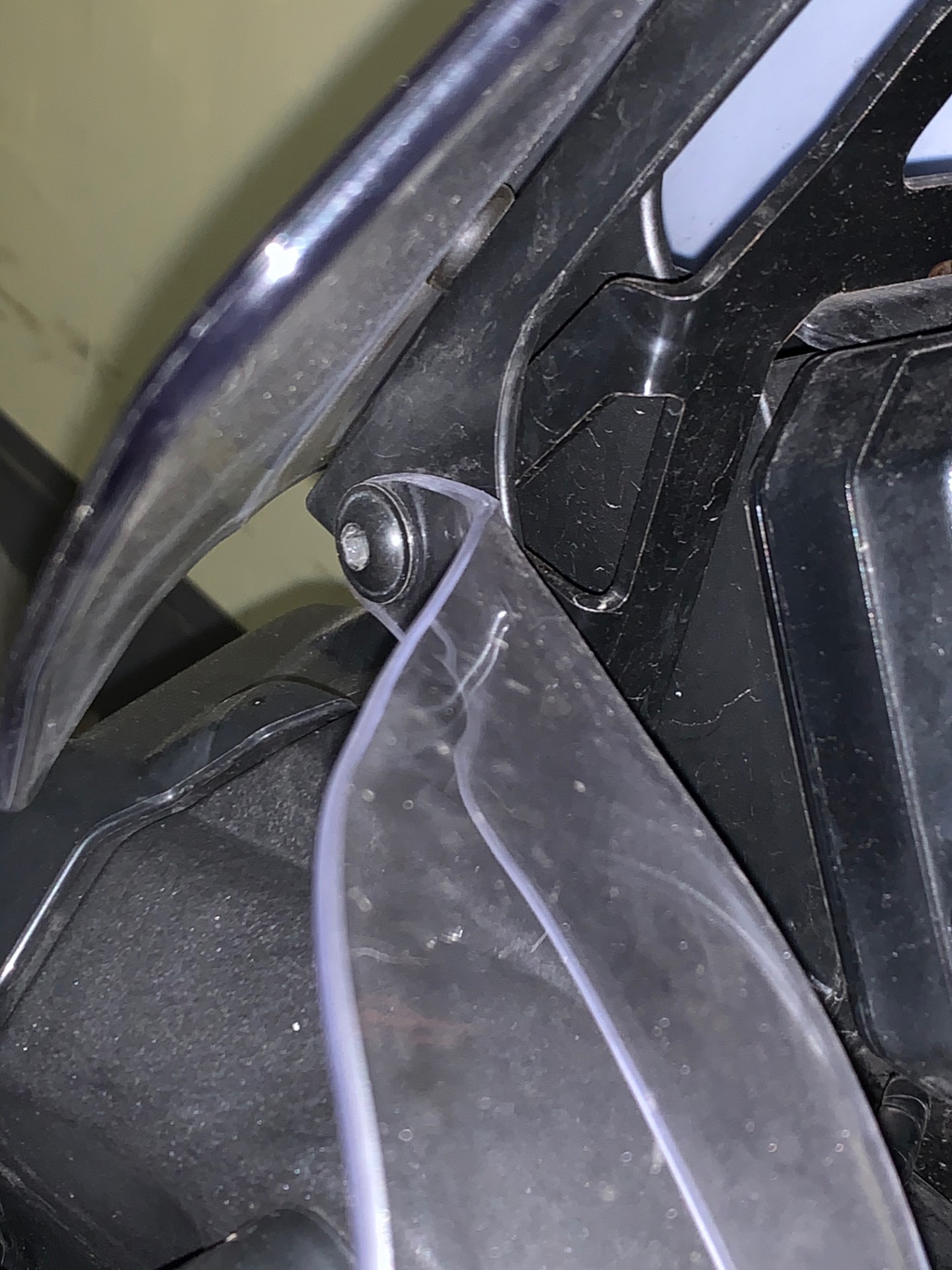 Ich musste nämlich das schwarze Kunststoff Dreieck mit dem Yamaha Emblem ( Instrumentenabdeckung ), vorne unter der Windschutzscheibe, abschrauben, um das dritte Loch des Windabweisers daran zuschrauben. Das Problem ist, dass das Dreieck danach nicht mehr drauf passt.